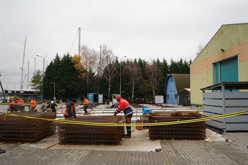 Inwestycja została podzielona na kilka etapów. Efekt pierwszych prac można było zaobserwować w minionym sezonie. Część placu przed głównym hangarem została zmodernizowana, a starą nawierzchnię zastąpiły nowe zbrojone płyty betonowe. Teraz gdy żeglarze nie korzystają z infrastruktury tak licznie, ruszyła wymiana pozostałych elementów.