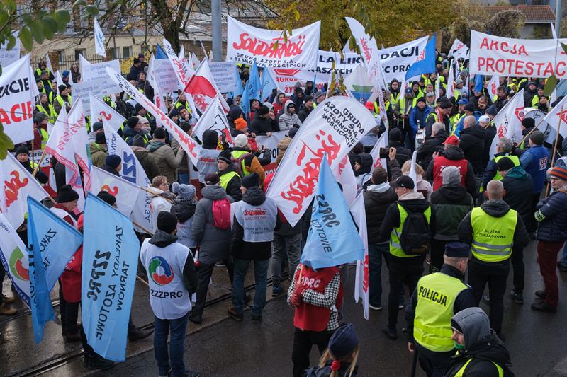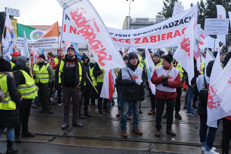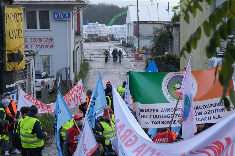 Niekontrolowany import nawozów z Rosji i Białorusi niszczy naszą branżę i musi być natychmiast powstrzymany - mówili pracownicy Zakładów Chemicznych "Police", którzy w środę protestowali na ul. Dębogórskiej w Szczecinie. Towarzyszyli im związkowcy z innych spółek wchodzących w skład Grupy Azoty, z Tarnowa, z Puław, z Kędzierzyna-Koźla.