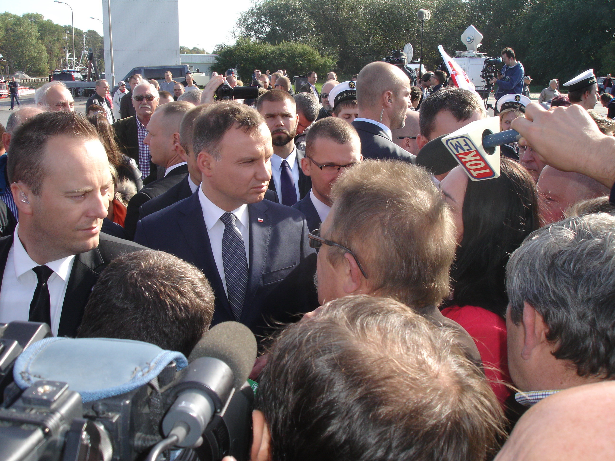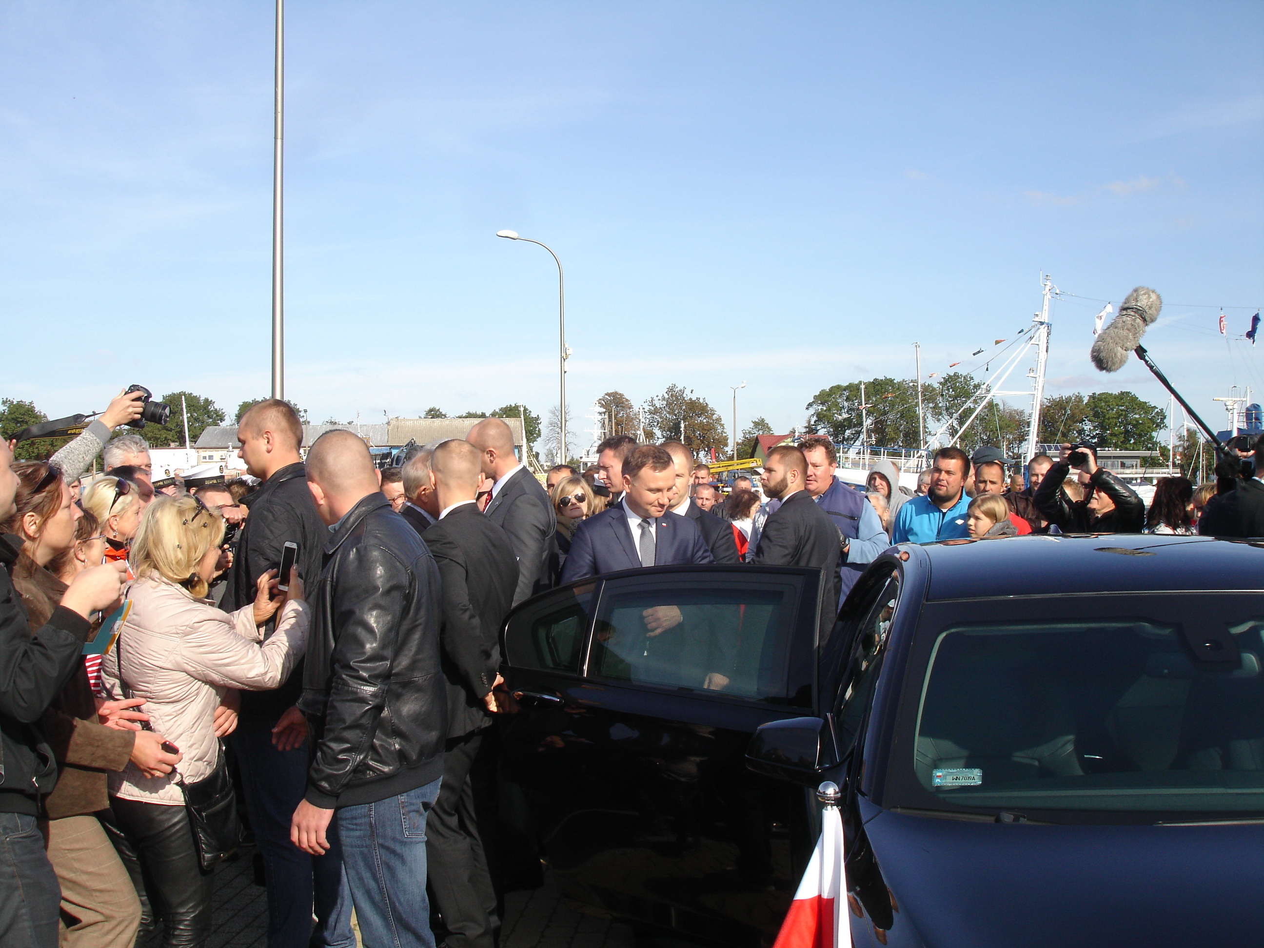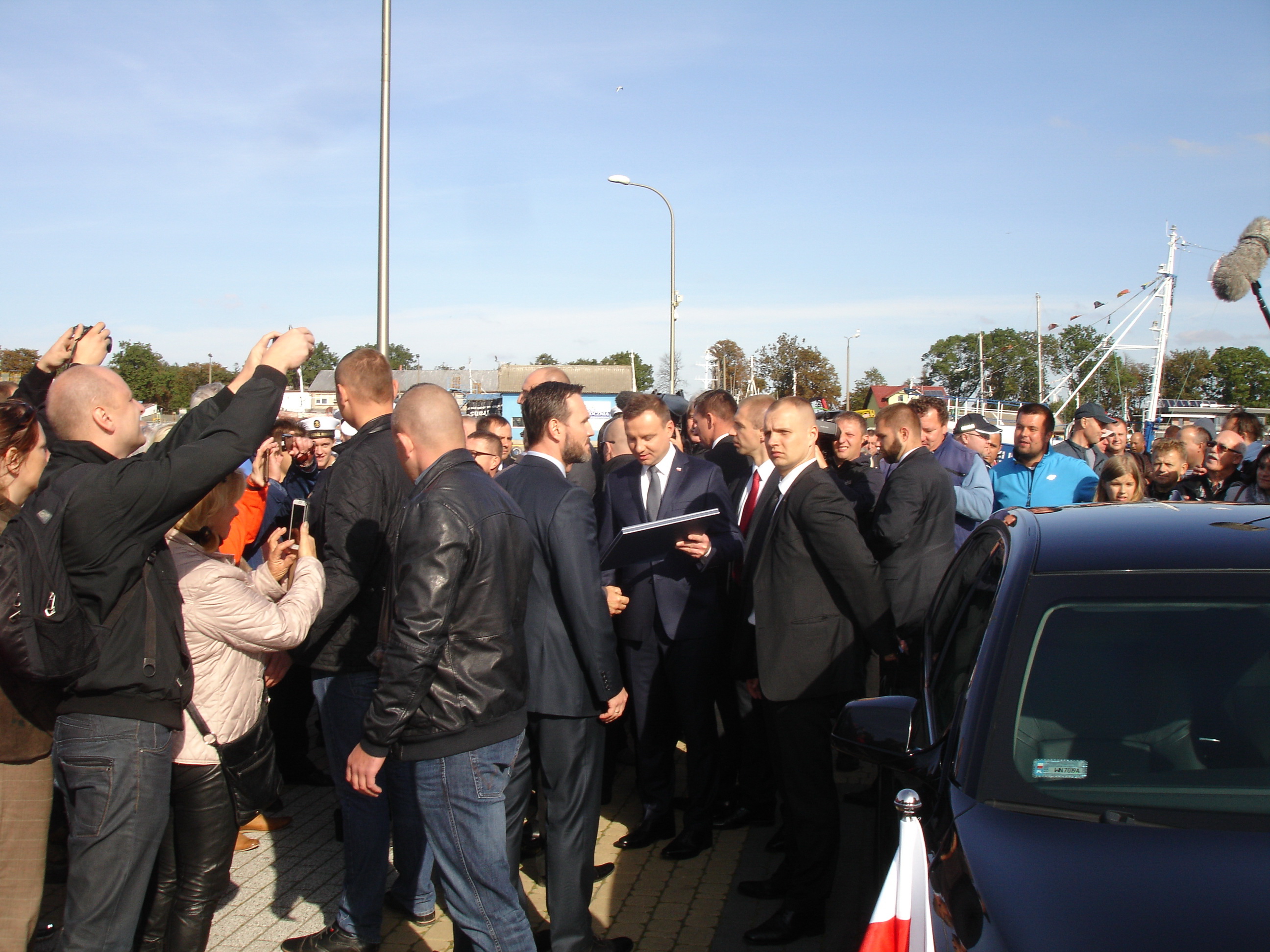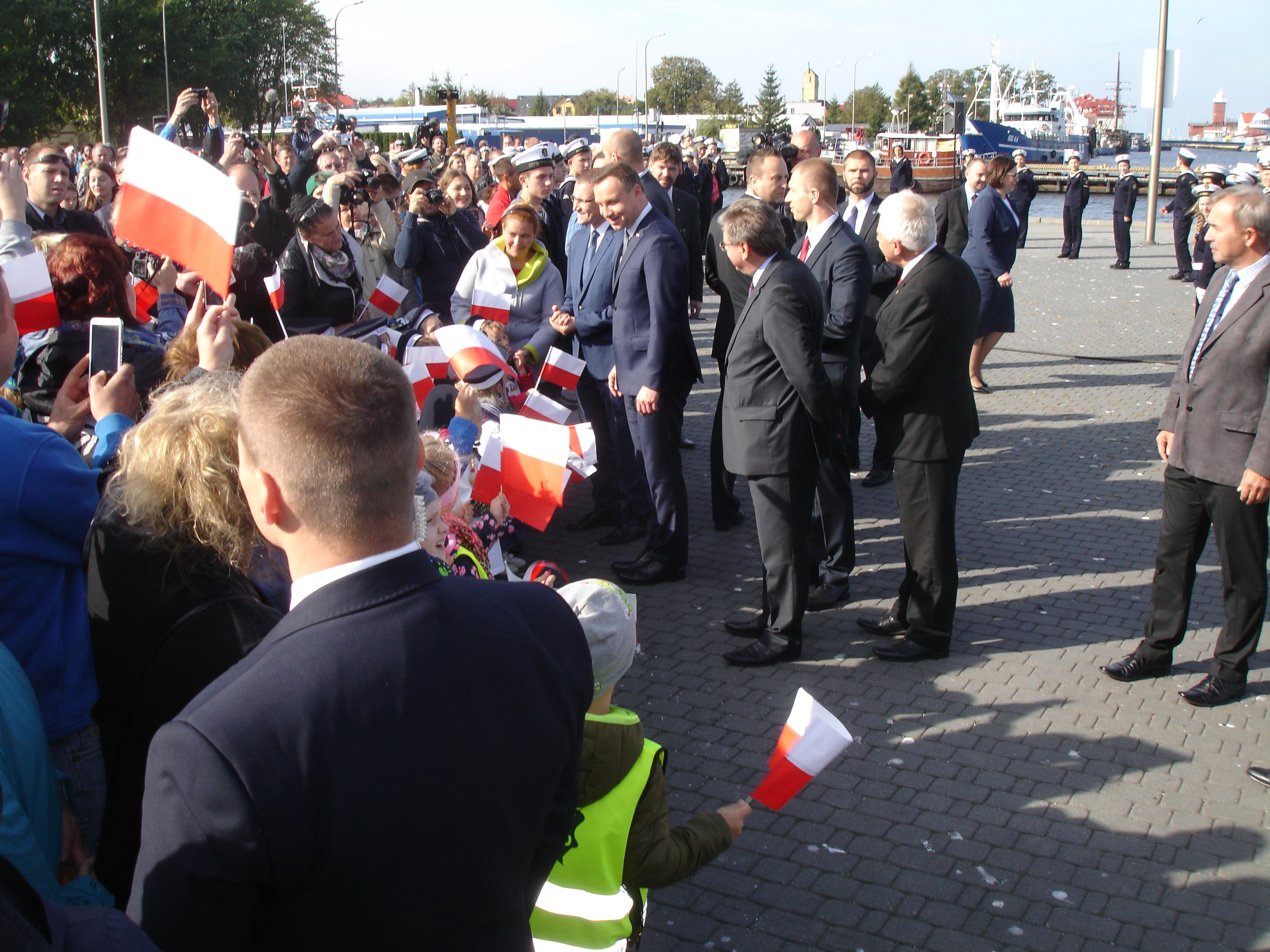 Początkowo wizyta Andrzeja Dudy wyglądała na kurtuazyjną, bo prezydenta RP witały przedszkolaki z biało-czerwonymi flagami w drodze na statek szkoleniowy Zespołu Szkół Morskich "Franek Zubrzycki II" na Nabrzeżu Słupskim. Obecni byli też burmistrz Darłowa Arkadiusz Klimowicz i starosta sławieński Wojciech Wiśniowski.