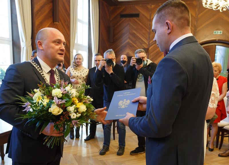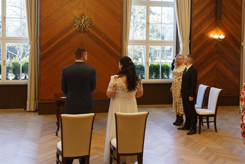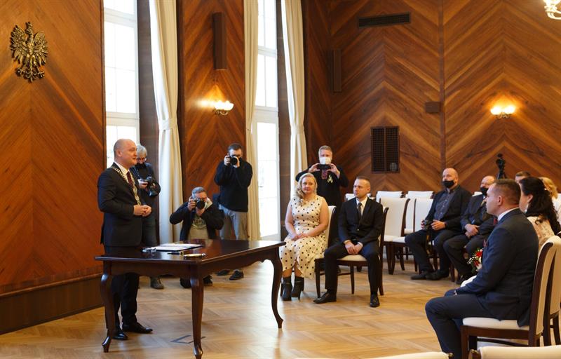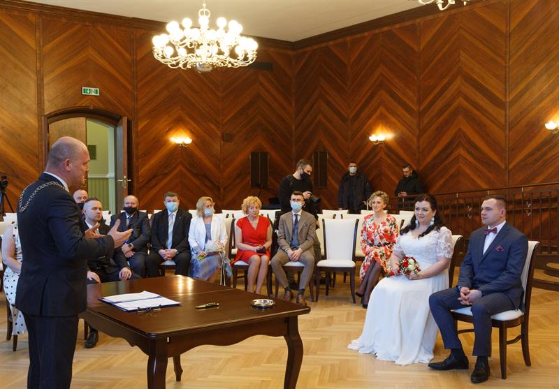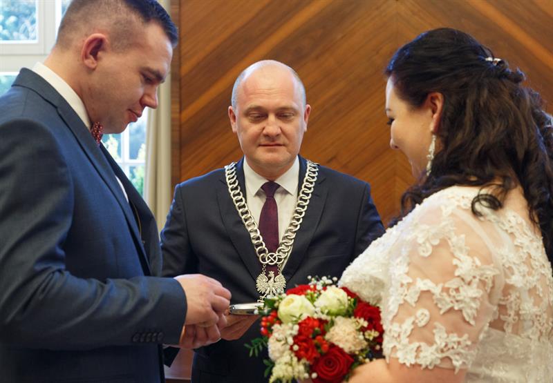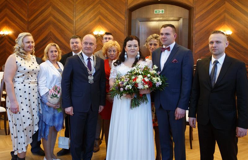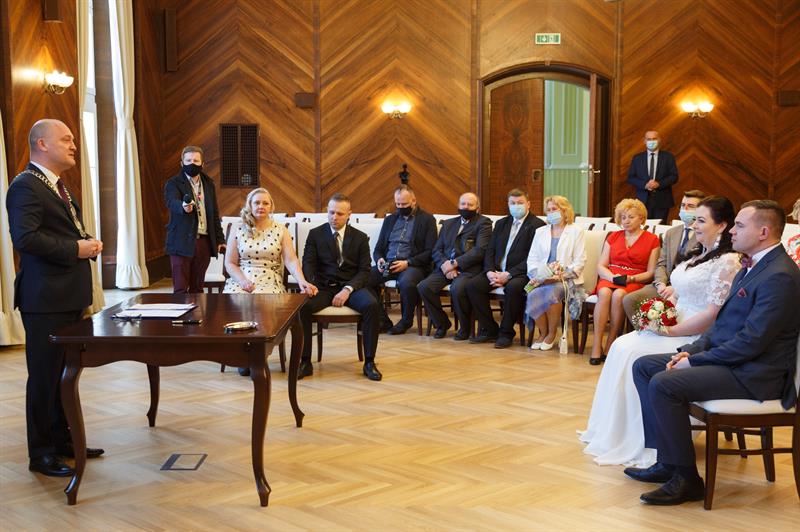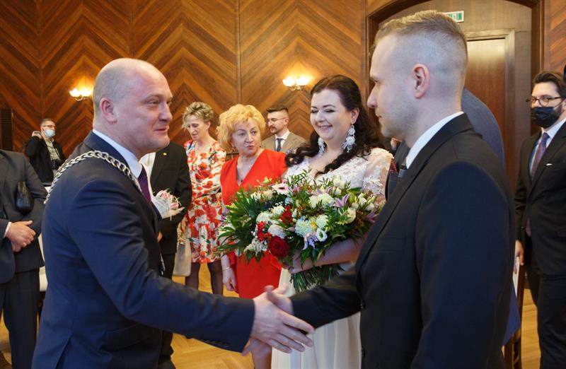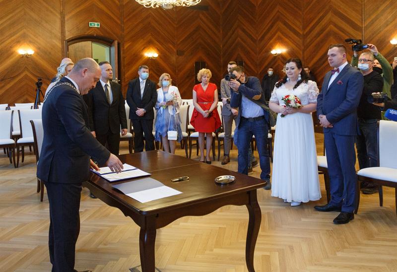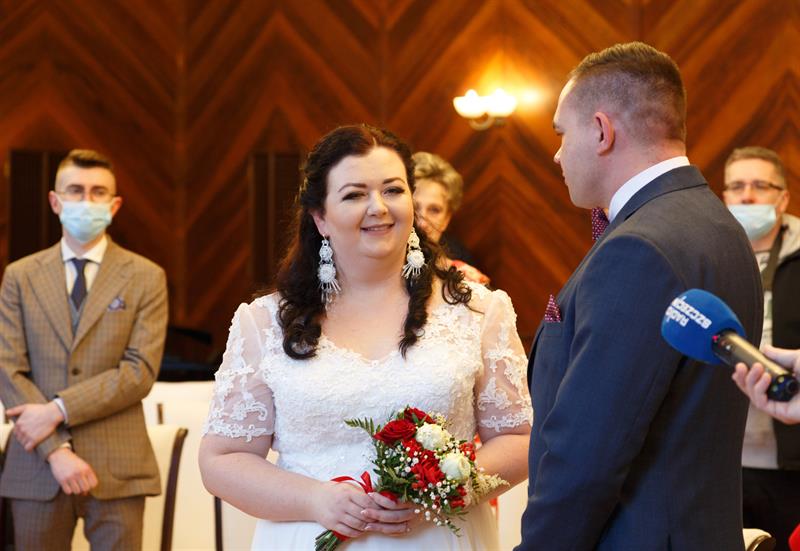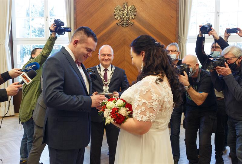 Iwona i Mariusz Stępień to pierwsza para, jaka zawarła związek małżeński w nowej sali ślubów. W piątek otwarto ją w szczecińskim Urzędzie Miejskim w miejscu, gdzie przez lata funkcjonowała sala sesyjna. Ślubu młodożeńcom, co również jest wyjątkową sytuacją, osobiście udzielił prezydent Piotr Krzystek.