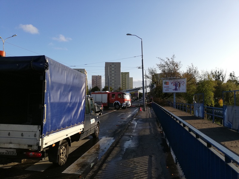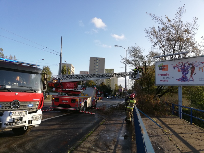 Strażacy usuwają wiatrołom na ul. Budziszyńskiej w Szczecinie - tuż za wiaduktem, obok sklepu, niedaleko pętli tramwajowej Pomorzany. Jest utrudniony ruch, samochody jadące od strony al. Powstańców Wielkopolskich w kierunku Budziszyńskiej są kierowane na ul. Smolańską.