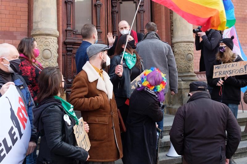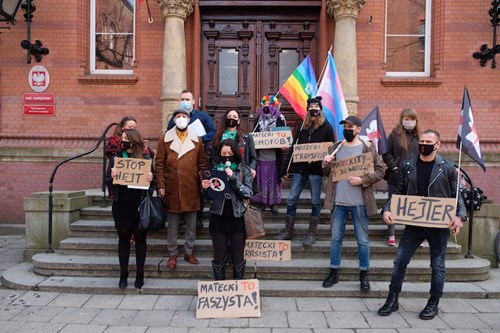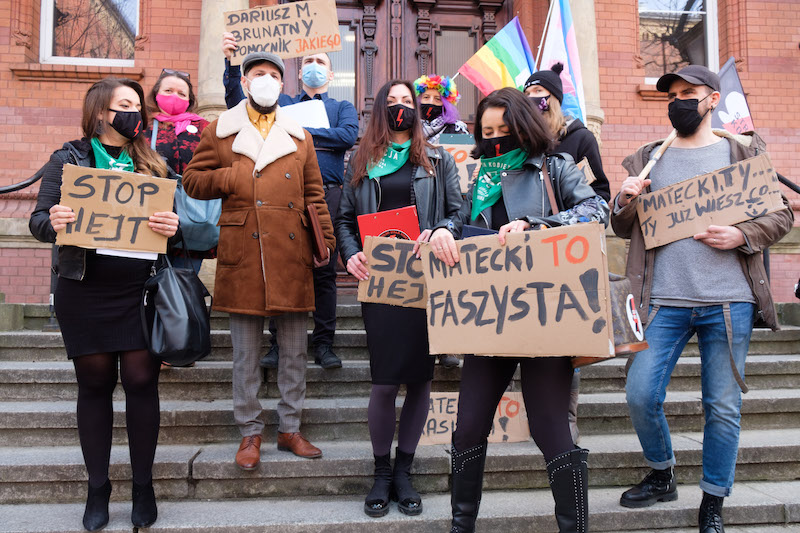 „Czy to Szczecin, czy Bruksela, tu się hejtu nie popiera” – w ten sposób przed wejściem do sądu demonstranci przywitali Dariusza Mateckiego, szczecińskiego radnego (PiS). Potem były jeszcze inne hasła: „Precz z faszyzmem” czy „Matecki, Szczecin się Ciebie wstydzi!”.