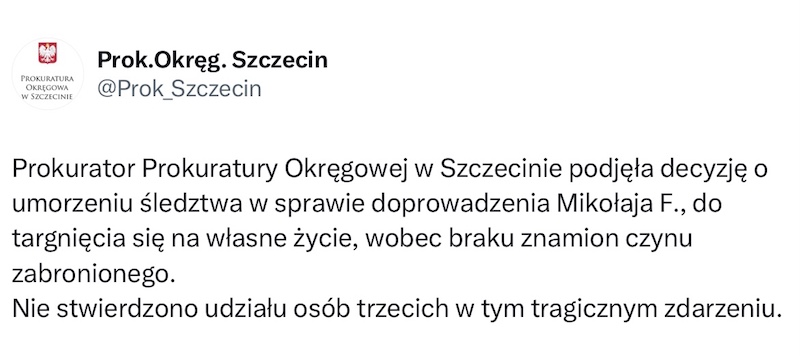 Prokurator Prokuratury Okręgowej w Szczecinie podjęła decyzję o umorzeniu śledztwa w sprawie doprowadzenia Mikołaja F. do targnięcia się na własne życie, wobec braku znamion czynu zabronionego.
