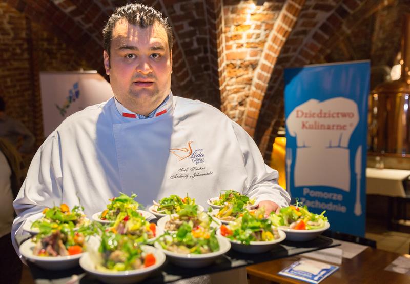 Na zdjęciu: Andrzej Jakomulski, szef kuchni restauracji hotelu Leda SPA w Kołobrzegu, prezentuje sałatkę z wątróbek dorszowych z ogórkiem kołobrzeskim, który jest jednym z naszych produktów tradycyjnych. Certyfikat odebrał z rąk marszałka Bartosz Suchorzewski, zastępca dyrektora hotelu.