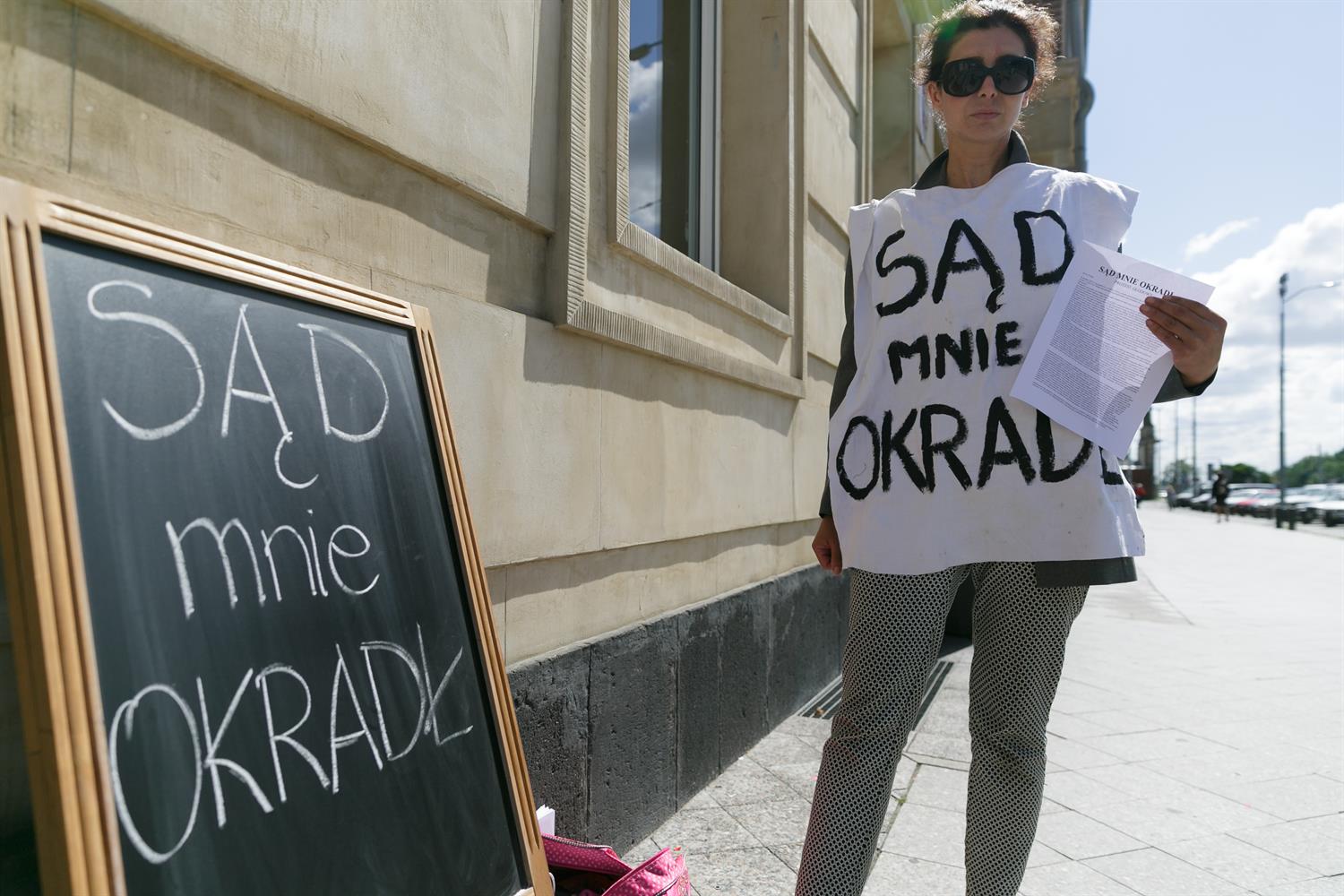 – Zabrano mi z konta 13252 zł! – mówi. Ma na sobie pelerynkę z napisem „Sąd mnie okradł" i butelkę wody w ręku. Zapewnia, że nie przerwie głodówki. Domaga się zwrotu pieniędzy (wraz z odsetkami) oraz wszczęcia kolejnego, tym razem „uczciwego", postępowania.