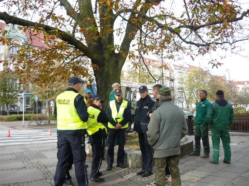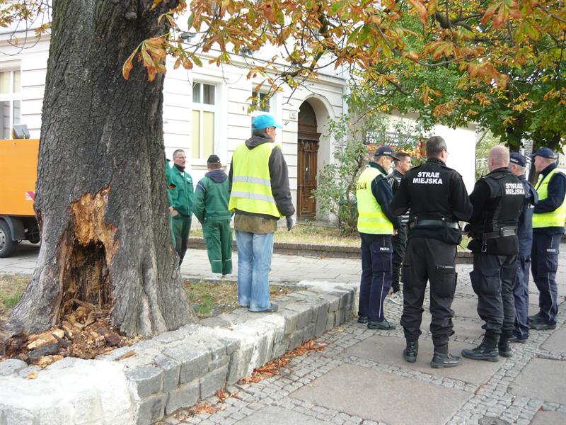 Dyskusji przysłuchiwali się pracownicy Zakładu Usług Komunalnych, którzy przyjechali wyciąć kasztanowiec. Drzewo miało częściowo spróchniałą podstawę pnia. Planowali je usunąć "po kawałkach ze względu na ruch i budynki" do godziny 15, lecz zablokowani przez protestującego, czekali na przybycie służb komunalnych i policji.