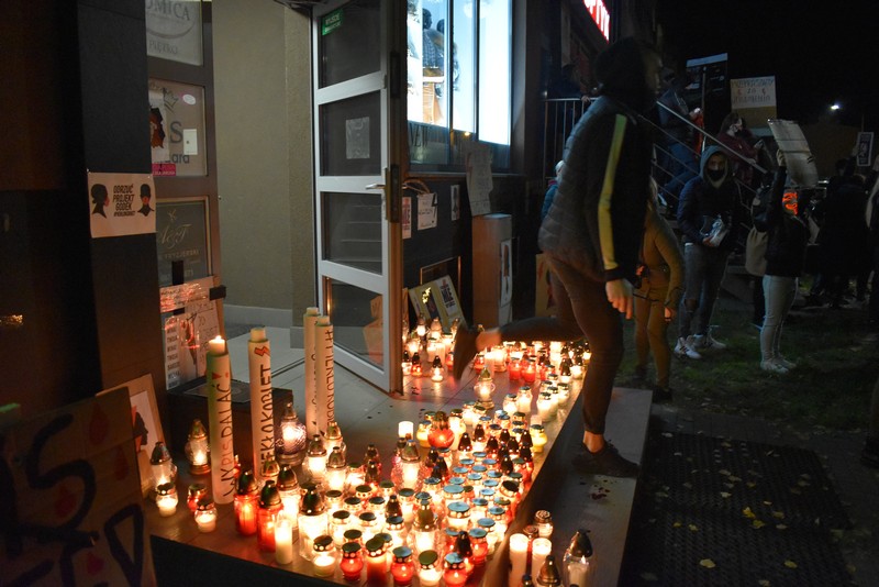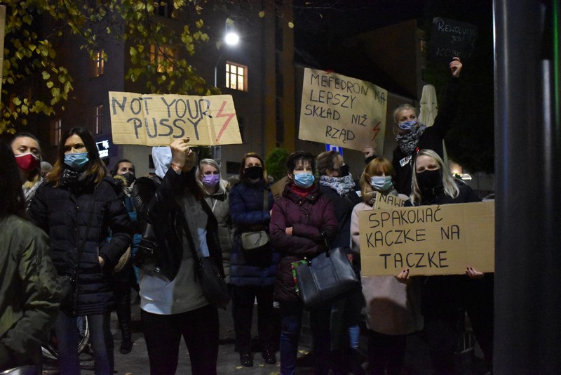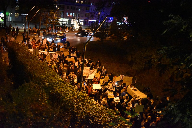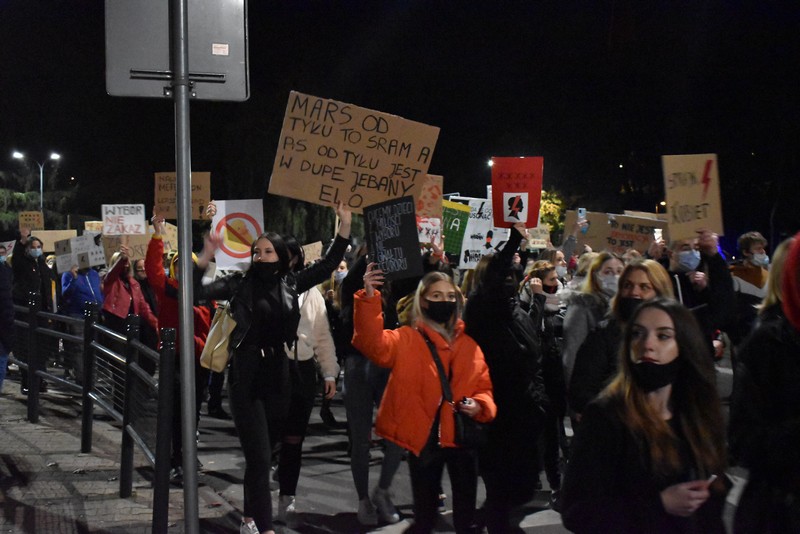 Protest stargardzkich kobiet jest coraz głośniejszy. Frekwencja na dzisiejszym przemarszu pobiła w Stargardzie wszelkie rekordy. Tłum zgromadził się najpierw przed biurem Prawa i Sprawiedliwości przy ul. Słowackiego. Było bardzo głośno; niektórzy odpalali race, inni trąbili klaksonami, skakali, wymachując transparentami i skandując "To jest wojna!".