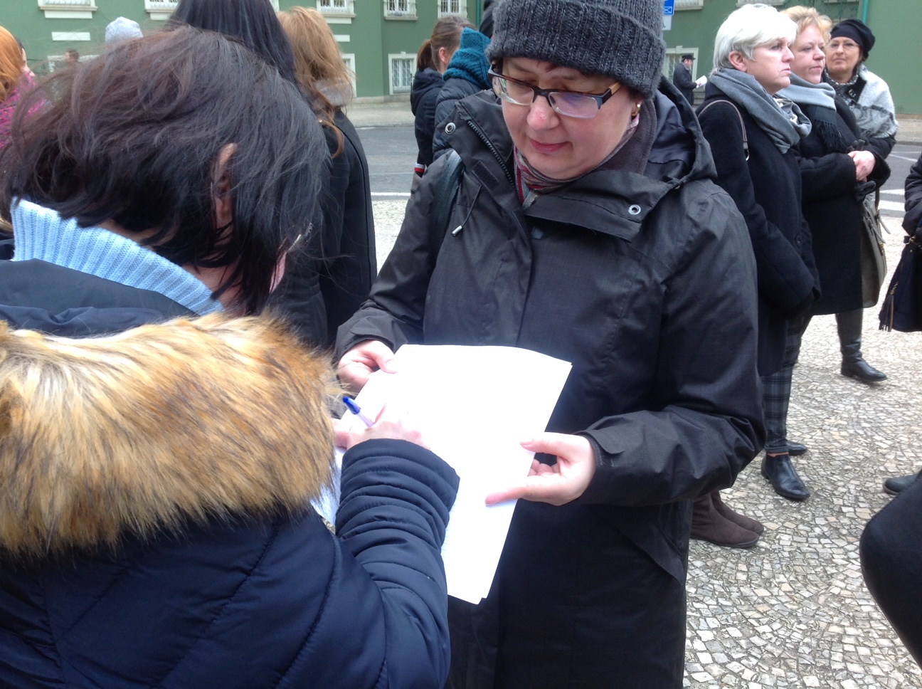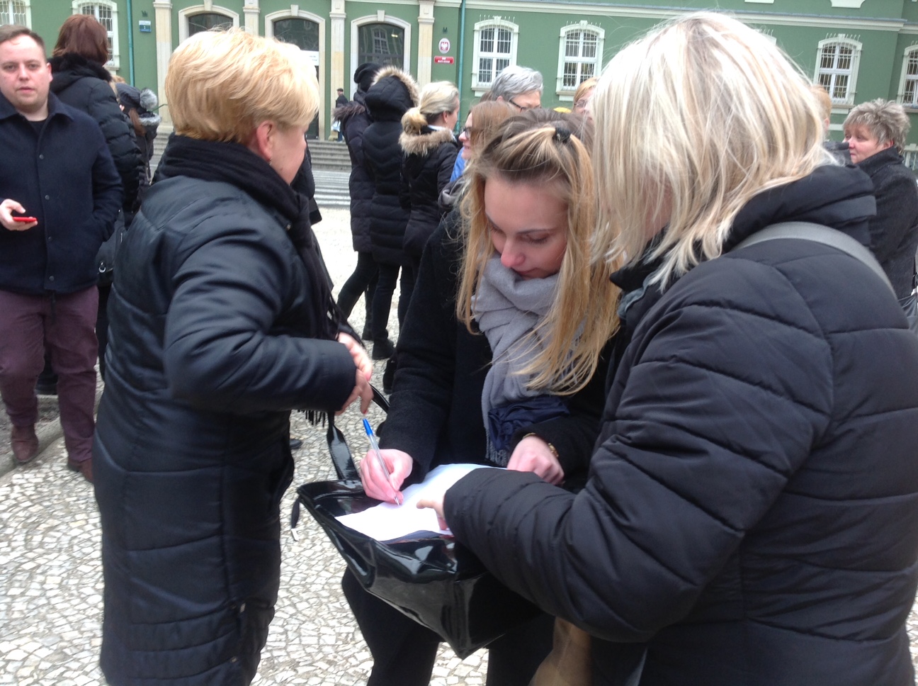 Fajne foto - panie składają pismo do prezydenta, a w tle jego pracownicy, różnica widoczna gołym okiem.