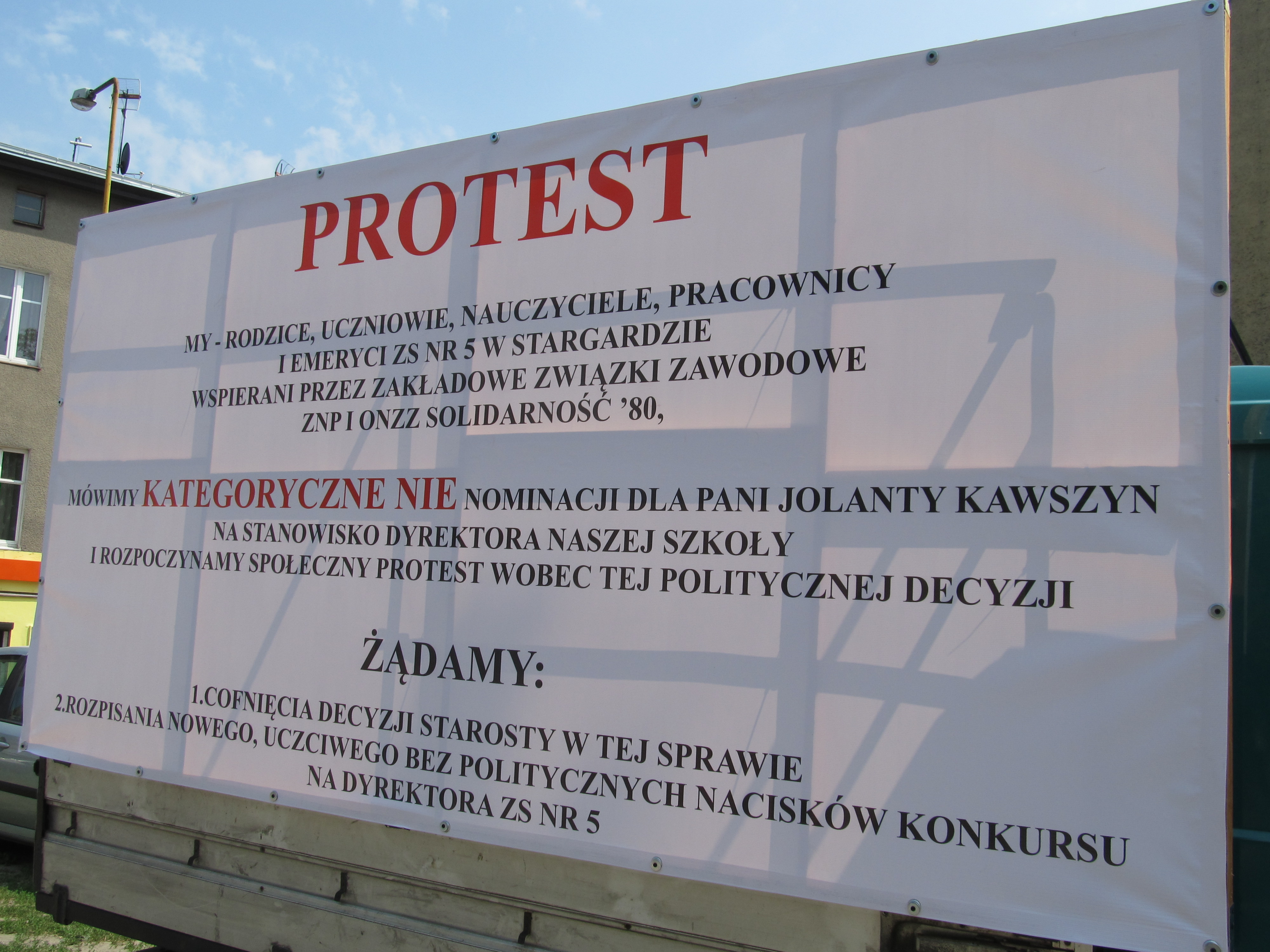 Protestujący domagają się „wycofania się z tej szkodliwej dla szkoły decyzji i rozpisania nowego, uczciwego oraz bez podtekstów politycznych konkursu". Ich zdaniem, objęcie przez J. Kawszyn funkcji dyrektorki ZS nr 5 spowoduje, że nie będzie uczniów zainteresowanych nauką w tej szkole.