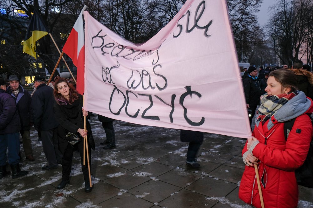 Na plakatach, które przygotowali uczestnicy, widniały hasła takie jak "Będziemy się od was óczyć" czy "Misiewicze do nauki". Nie zabrakło elementów humorystycznych. Dwóch młodych mężczyzn w czarnych okularach, którzy przedstawili się jako studenci ekonomii, trzymało transparent z napisem "Nie dla ananasa na pizzy".