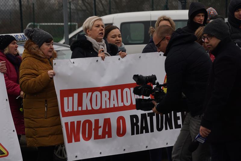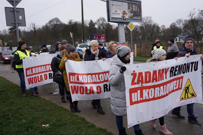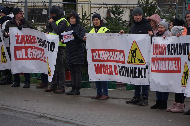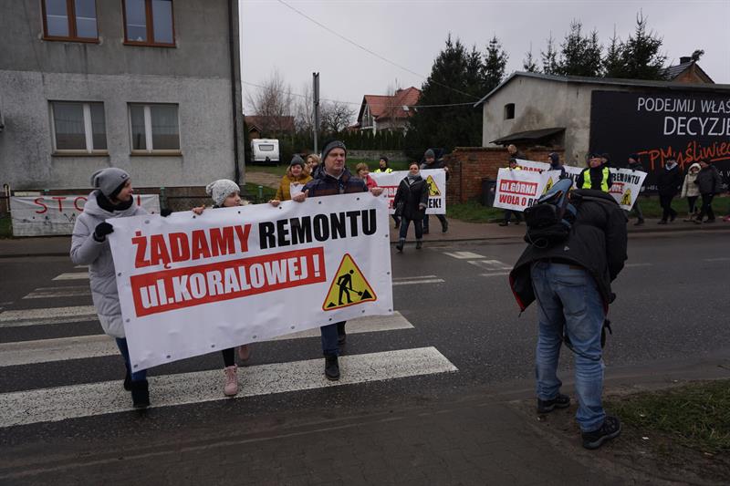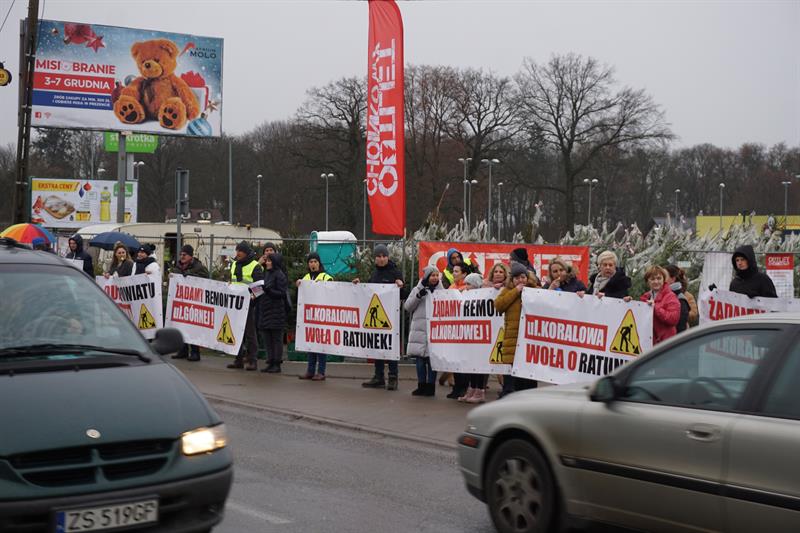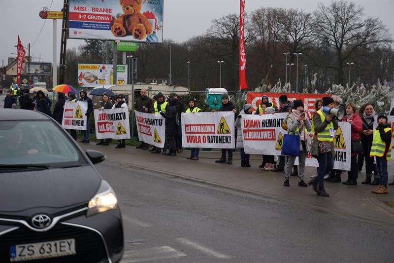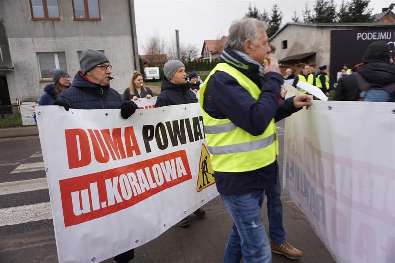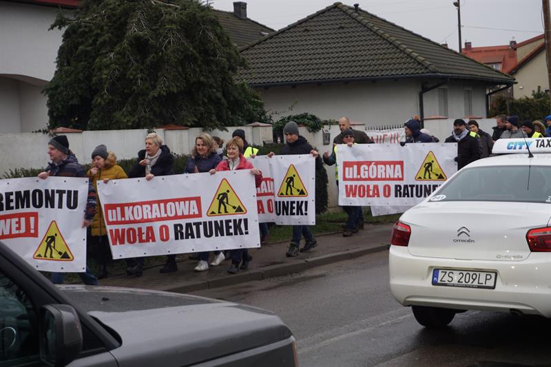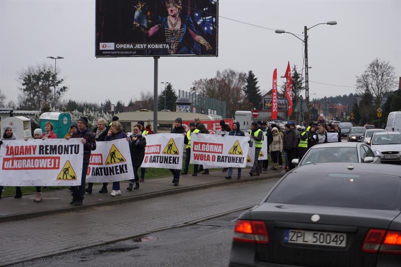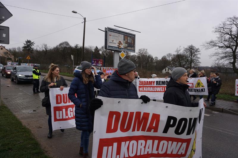 Na protest przyszli też mieszkańcy szczecińskiego odcinka ul. Koralowej oraz Modrej. - Tamtejsi mieszkańcy również się mobilizują, a dzisiaj przyszli pokiwać prezydentowi Krzystkowi palcem - stwierdziła Ciurzyńska. - Dziś walczymy o drogę powiatową, ale nie zapominamy o części szczecińskiej. Są przygotowane banery.