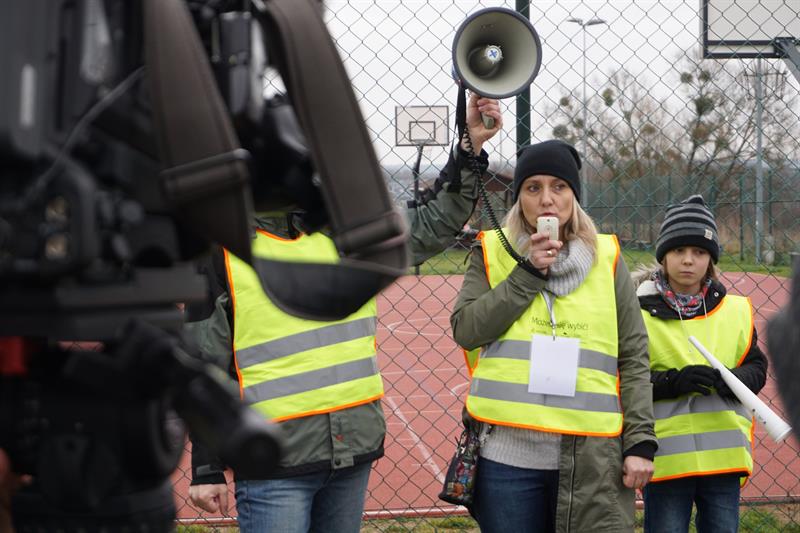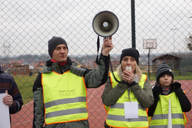 Protestujący nie chcieli blokować ulicy. W asyście policji kilkukrotnie przeszli chodnikami od boiska gminnego do Biedronki i z powrotem. Po drodze wznosili okrzyki: "Czas na nową drogę", "Tak wyglądają przejścia dla pieszych" itp.