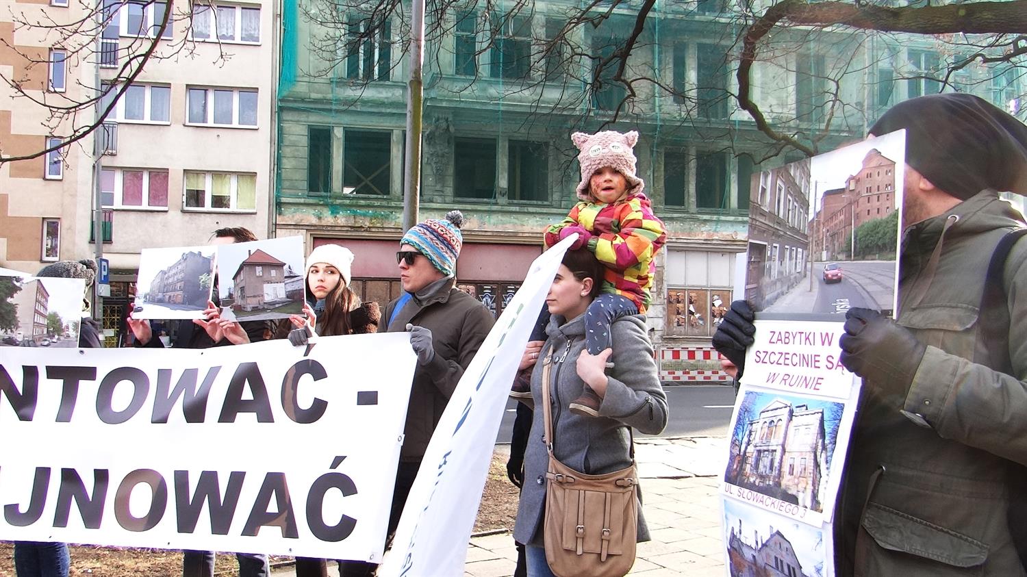 Na zdjęciu: Remontować, nie rujnować! - skandowali uczestnicy demonstracji dla ocalenia zabytków Szczecina, jaka odbyła się w sobotę (24 bm.) na pl. Zwycięstwa, przed zagrożoną wyburzeniem ruiną d. hotelu „Piast".