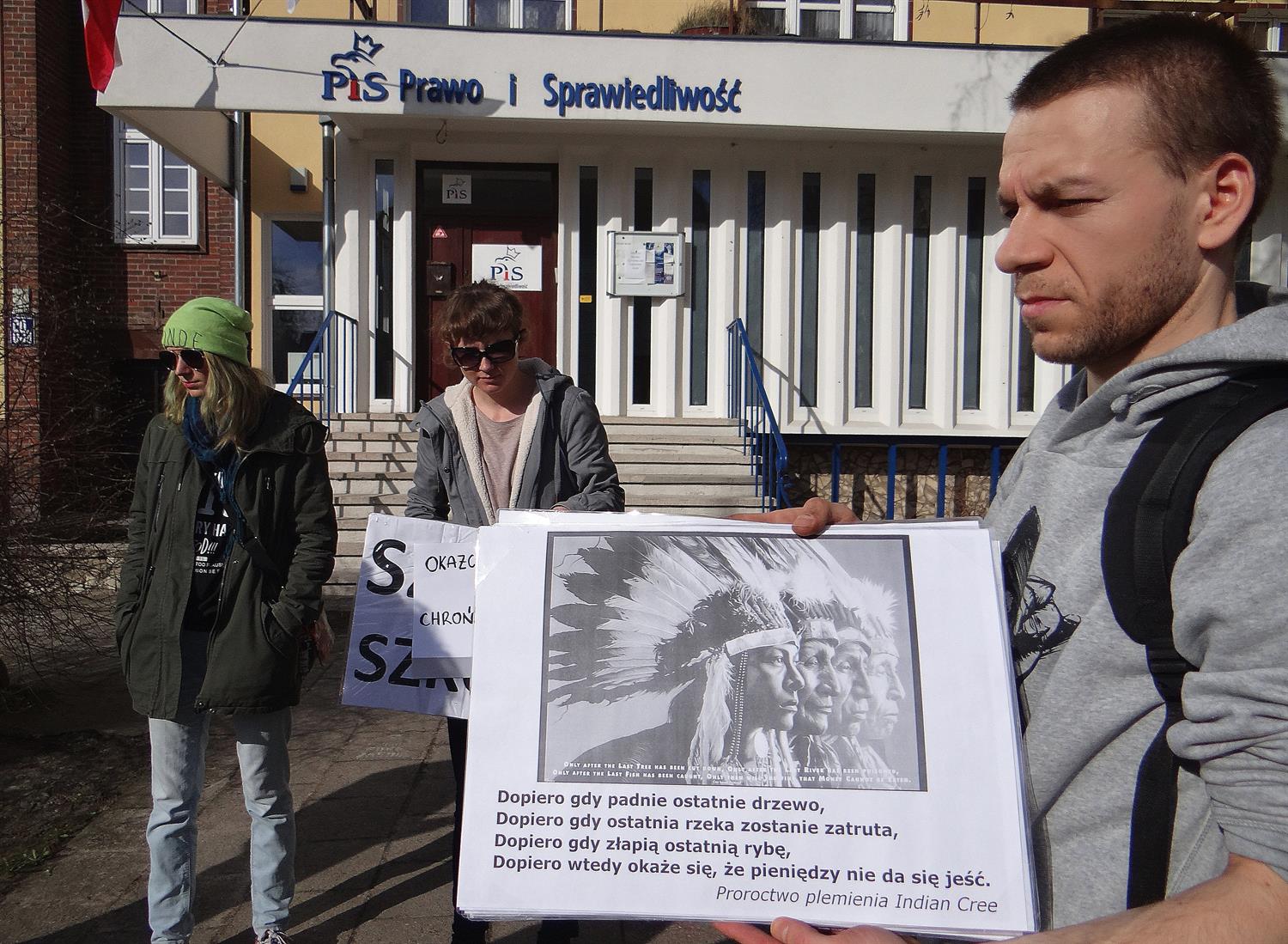 - Jesteśmy tu po to, aby wyrazić swój sprzeciw wobec tak rabunkowej eksploatacji środowiska, jaką Polakom funduje PiS. Manifestujemy przeciwko absurdowi w wykonaniu tej partii: forsuje gospodarkę opartą na węglu, daje przyzwolenie na wycinkę drzew produkujących tlen, a potem każe nam wszystkim żyć we wszechobecnym smogu - komentowała Małgorzata Rawa, jedna z aktywistek Inicjatywy na Rzecz Zwierząt BASTA!, jaka zorganizowała protest przed szczecińską siedzibą PiS.