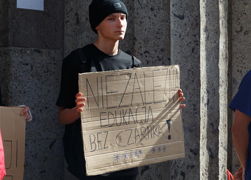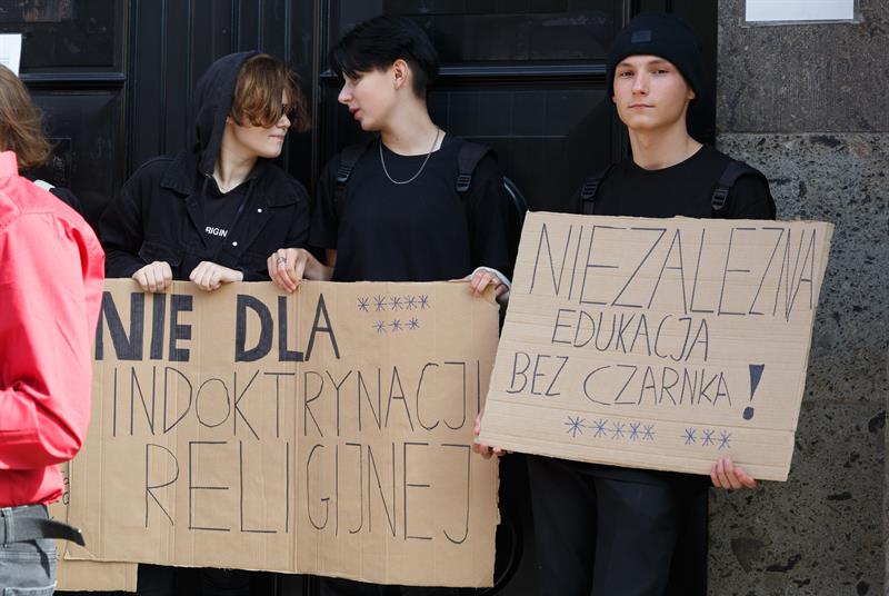 Manifestanci przynieśli ze sobą transparenty z hasłami m.in.: "Nie dla indoktrynacji religijnej", "Niezależna edukacja bez Czarnka", "Nie dla średniowiecza w szkole".
