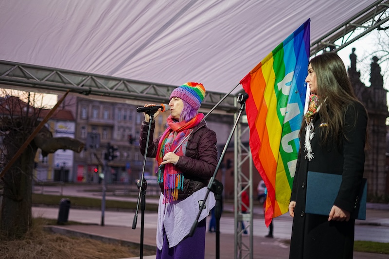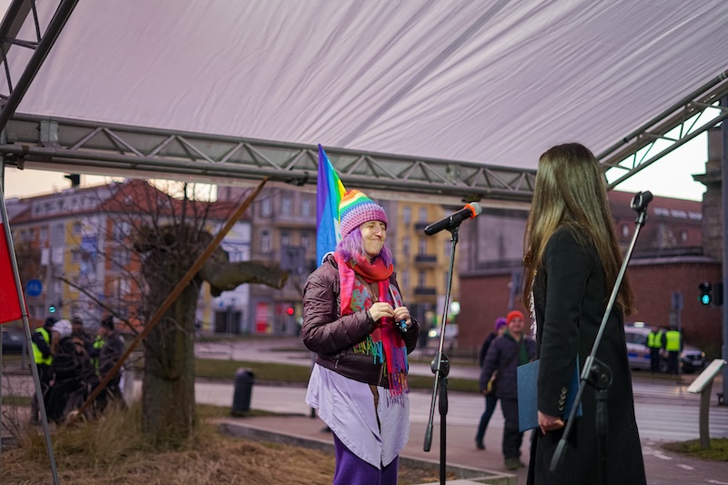 Po mowie Teresy Kaliny na scenę zaproszono Monikę „Pacyfkę” Tichy ze stowarzyszenia Lambda. W swoim przemówieniu wspomniała o tym, że wojna i przemoc zaczynają się od prześladowania mniejszości seksualnych, podając przykłady polityki Putina, Trumpa czy Orbana.