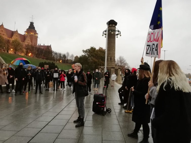 - To wspaniałe, że jesteście tutaj i wspieramy się nadal - rozpoczęła manifestację Dagmara Adamiak, przewodnicząca Młodej Lewicy Zachodniopomorskie. - Bo niestety prawo, które odbiera prawa kobietom, nie zostało cofnięte, cały czas wygląda to tragicznie. Dlatego nie możemy się poddać i dziś tu jesteśmy. Emocje już są trochę inne, ale ból wciąż jest w nas. Czujemy się zrezygnowani, bo nic z nas sobie nie robią. Mówią, że nasz ogień gaśnie, PiS nas olał, po prostu postanowił poczekać. Wiadomo, że nie możemy protestować w nieskończoność, musimy wrócić do swojego życia. Ale co to oznacza dla kobiet? To oznacza powrót do życia, w którym nie szanuje się naszego prawa do wolności, nie szanuje się tego, że nasze ciało jest nasze. To życie, w którym godność kobiet została zlekceważona i opluta. Podjęli decyzje o naszych ciałach za naszymi plecami, ponad naszymi głowami. Podmiot nie zgadza się z orzeczeniem, ale oni mają to gdzieś. Milczą, a my stoimy tu w deszczu i po raz kolejny mówimy: oddajcie nam nasze prawa!