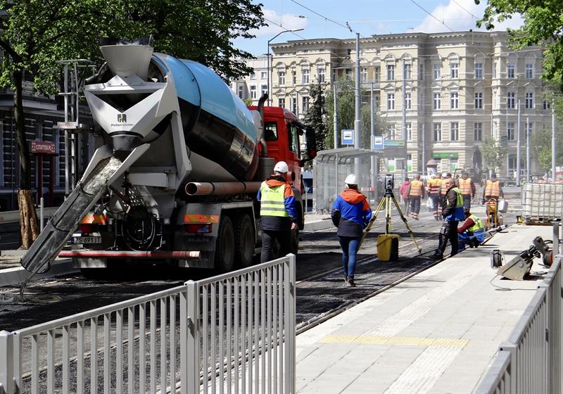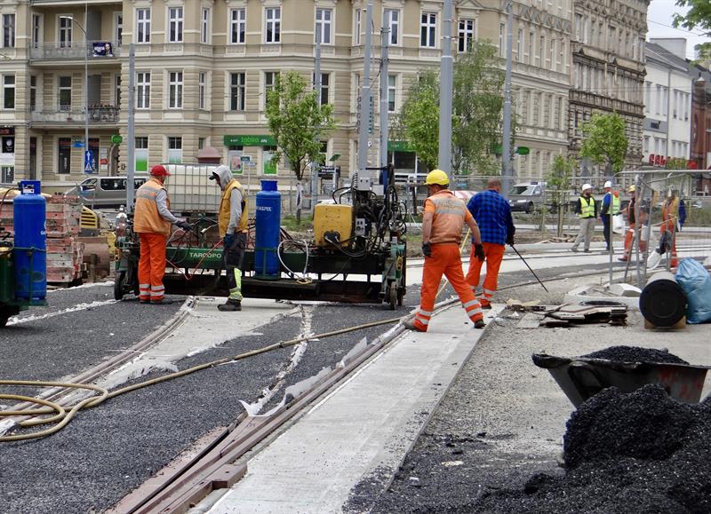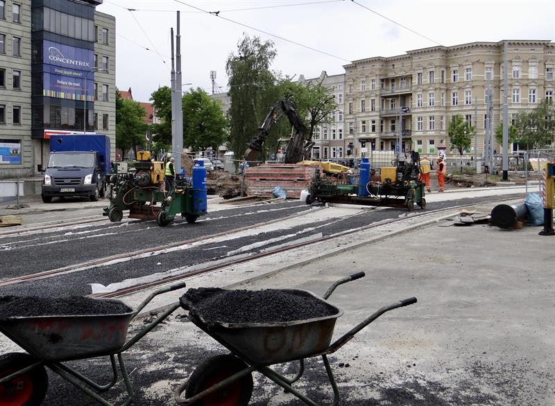 Od ubiegłego tygodnia trwały tam wypełnianie warstwą asfaltu międzytorzy gotowego już pasa torowiska, które będzie de facto dodatkową jezdnią pośrodku tego odcinka i w obrębie rozjazdów na wyspie samego ronda, pełniąc funkcję pasa do jazdy dla autobusów w sytuacjach nagłych pojazdom służ ratunkowych. Te prace są kontynuowane w tym tygodniu. Asfaltowane są teraz fragmenty na wysokości rozjazdów zmontowanych dotąd i już w większości na wyspie centralnej pl. Szarych Szeregów.