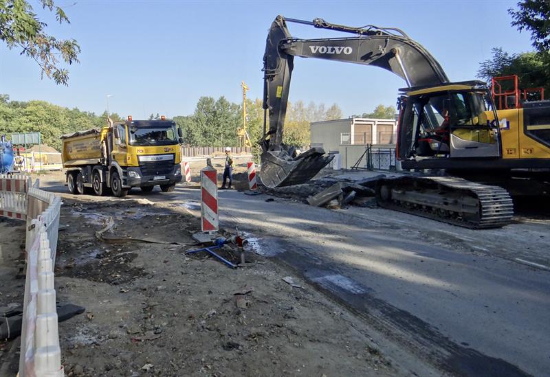 Na odcinku starej ulicy Władysława Szafera w rejonie jej skrzyżowań z ulicami Eugeniusza Romera, Modrą i Szeroką teraz demontowane są ostatnie słupy oświetleniowe, znikają też resztki starej jezdni. Przez plac budowy wytyczone zostały tymczasowy przejazd dla kursujących tamtędy autobusów linii 75 i wąskie przejście dla pieszych. Ponadto wykopy i układanie pozostałych odcinków nowego uzbrojenia wymusiły odsunięcie od ich poprzedniej również tymczasowej lokalizacji przystanków - teraz znajdują się one bliżej bloków na wysokości przedszkola przy ul. Eugeniusza Romera 5.