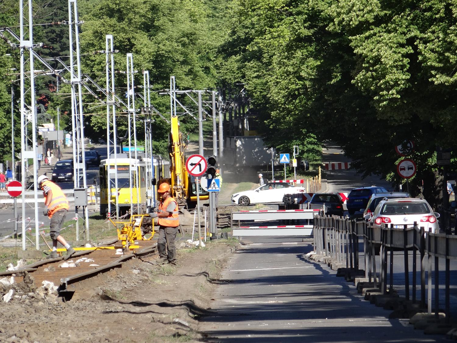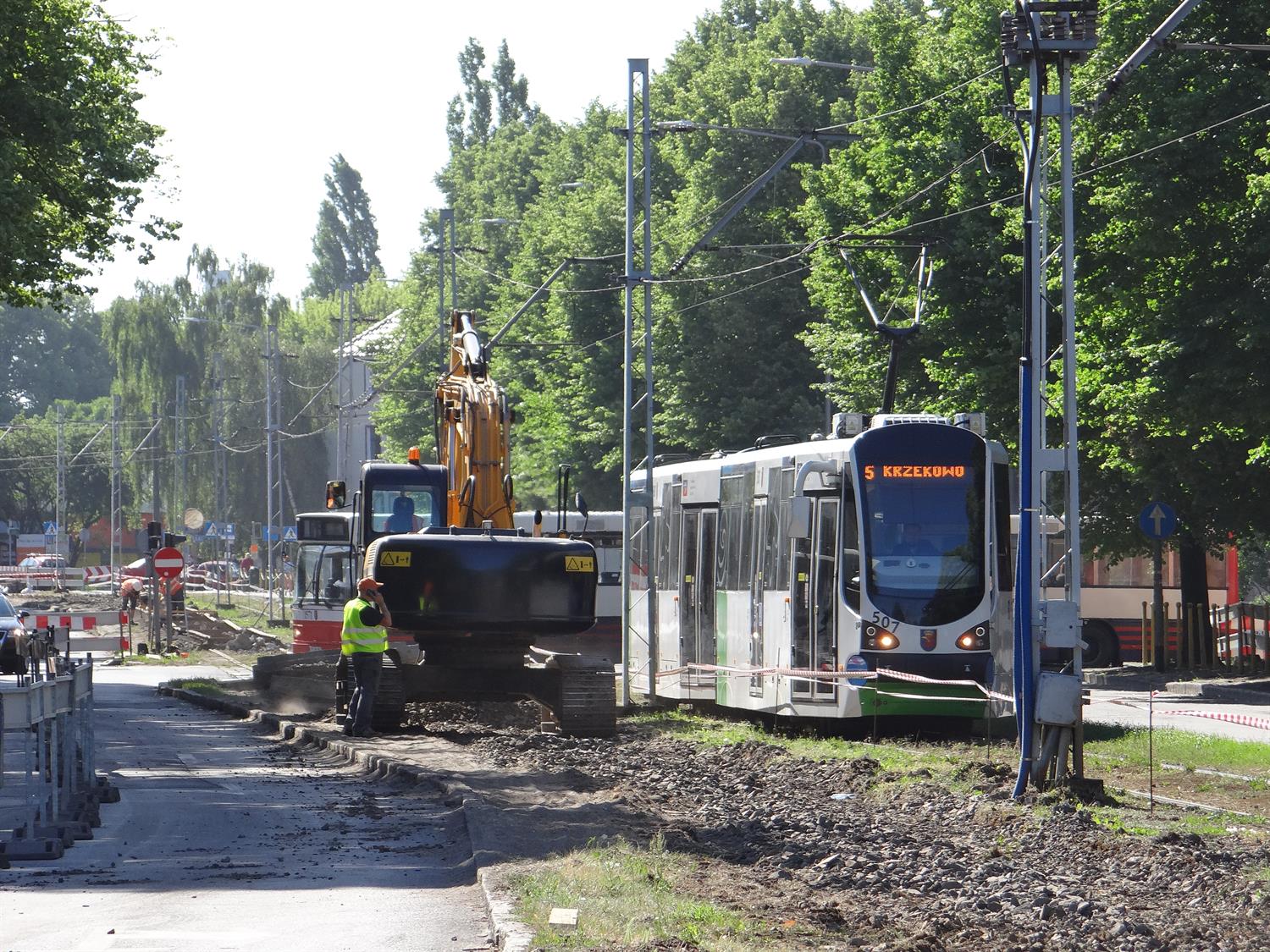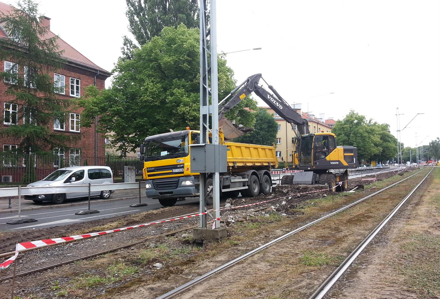 Koparki i brygady robotników spółki KML, podwykonawcy inwestycji, od minionego tygodnia demontują właśnie odcinek starego, wyłączonego w tym miejscu z eksploatacji, toru w kierunku pętli na Krzekowie. Rozpoczęły się również prace ziemne – koparki przygotowują rowy pod nowe instalacje infrastruktury podziemnej. ©℗