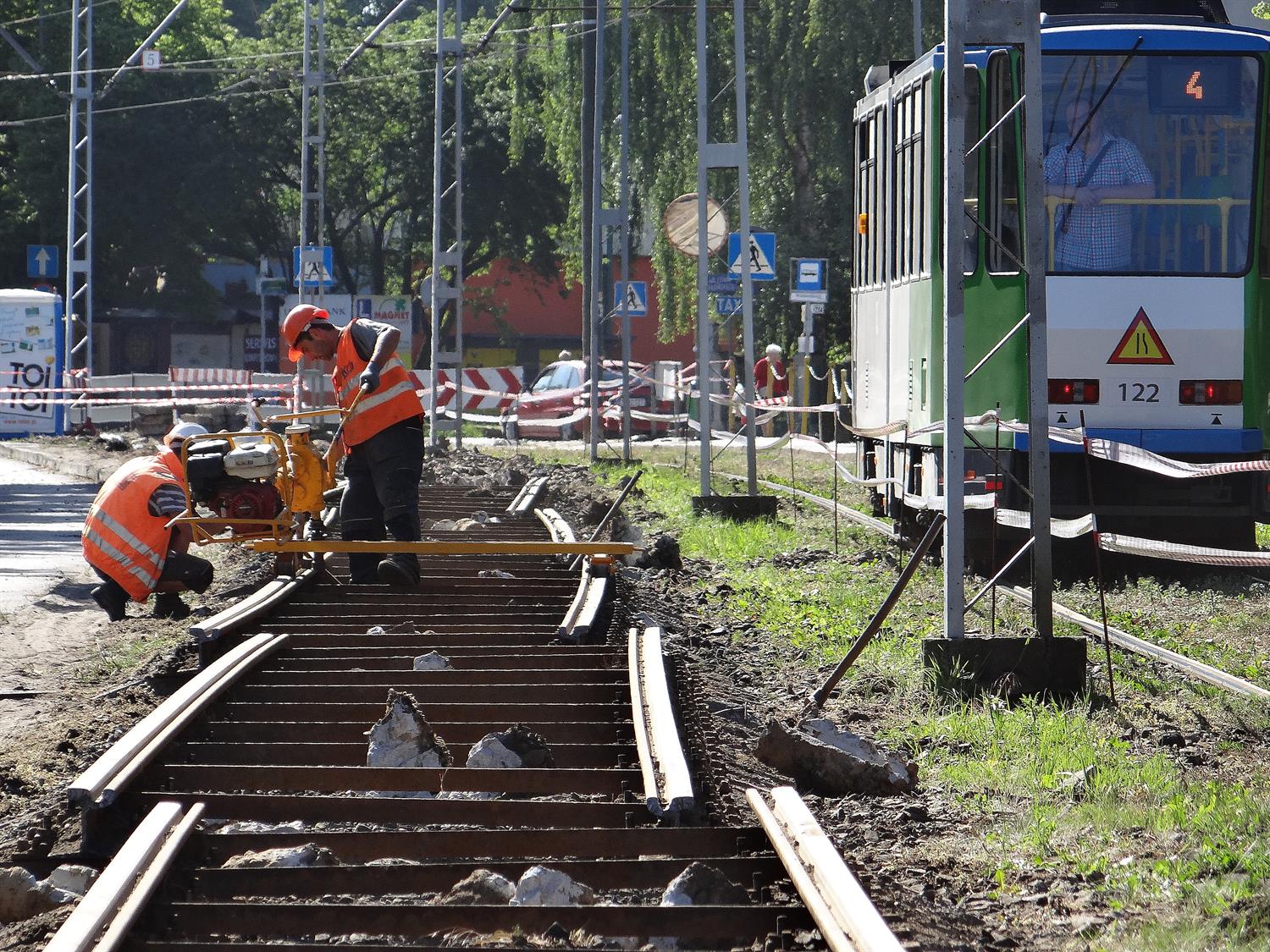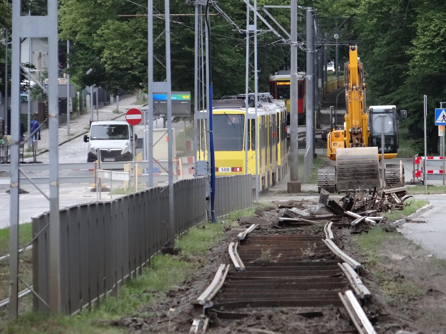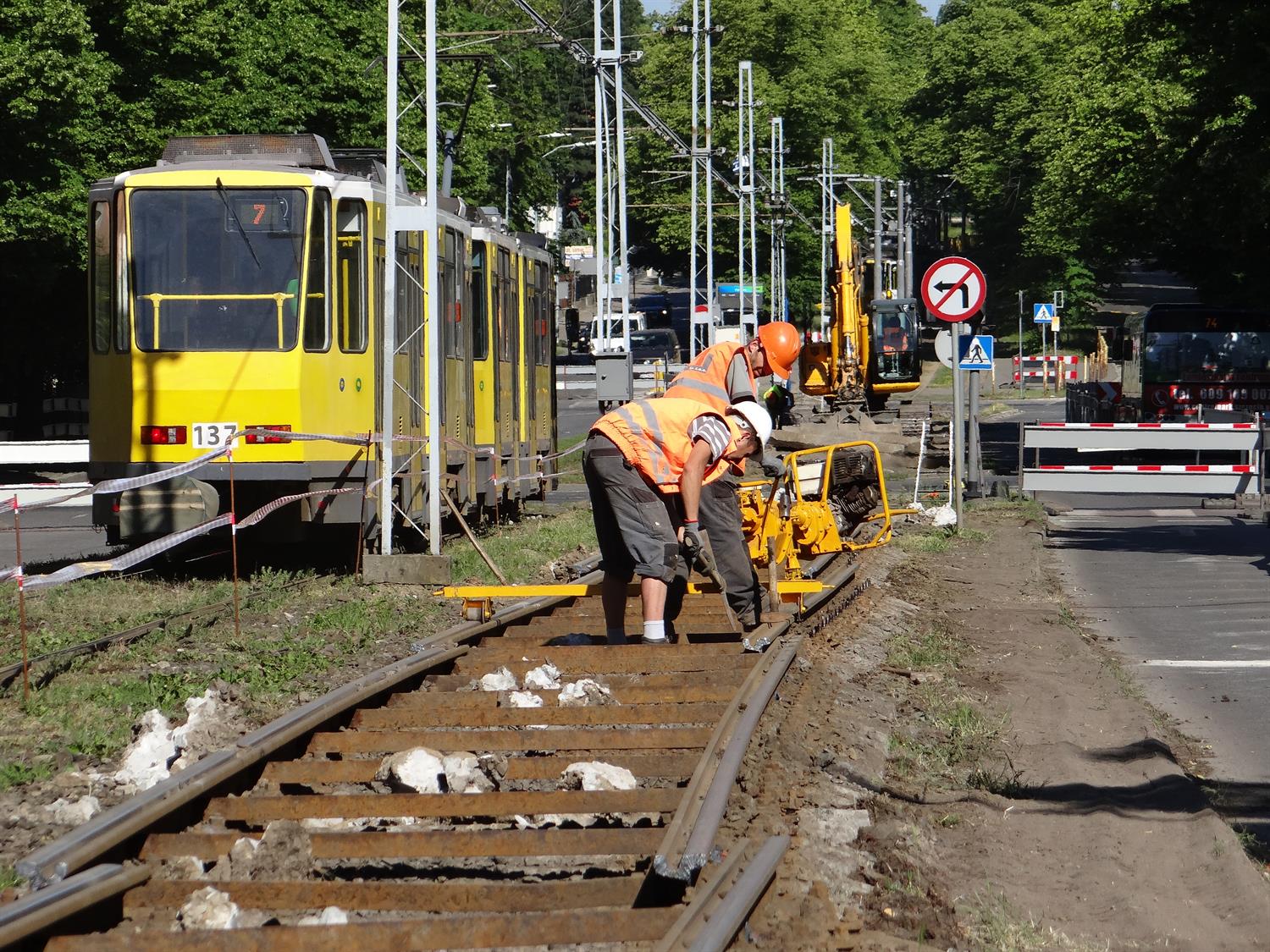 Koparki i brygady robotników spółki KML, podwykonawcy inwestycji, od minionego tygodnia demontują właśnie odcinek starego, wyłączonego w tym miejscu z eksploatacji, toru w kierunku pętli na Krzekowie. Rozpoczęły się również prace ziemne – koparki przygotowują rowy pod nowe instalacje infrastruktury podziemnej. ©℗