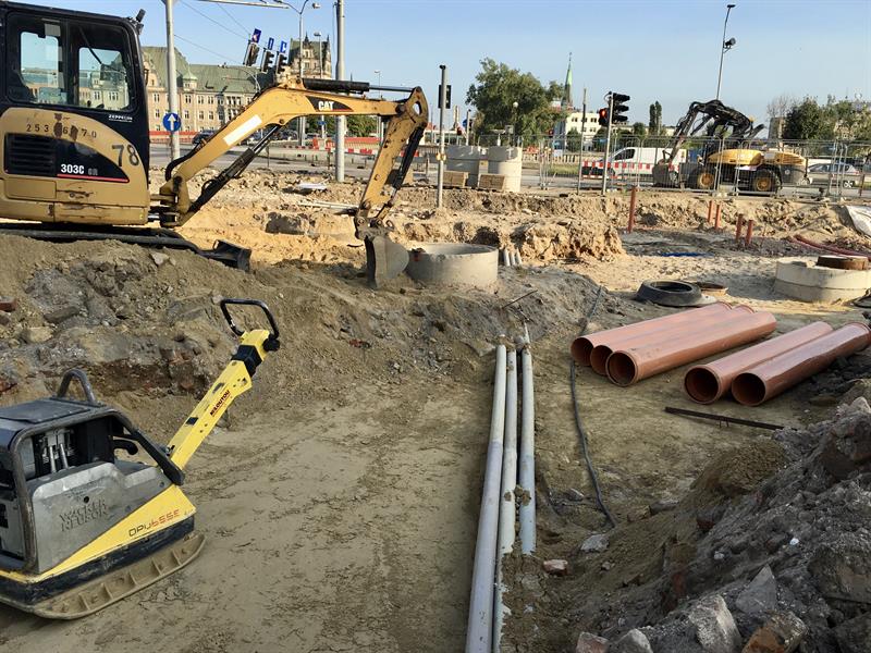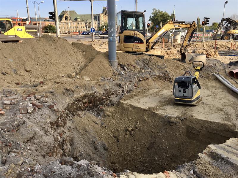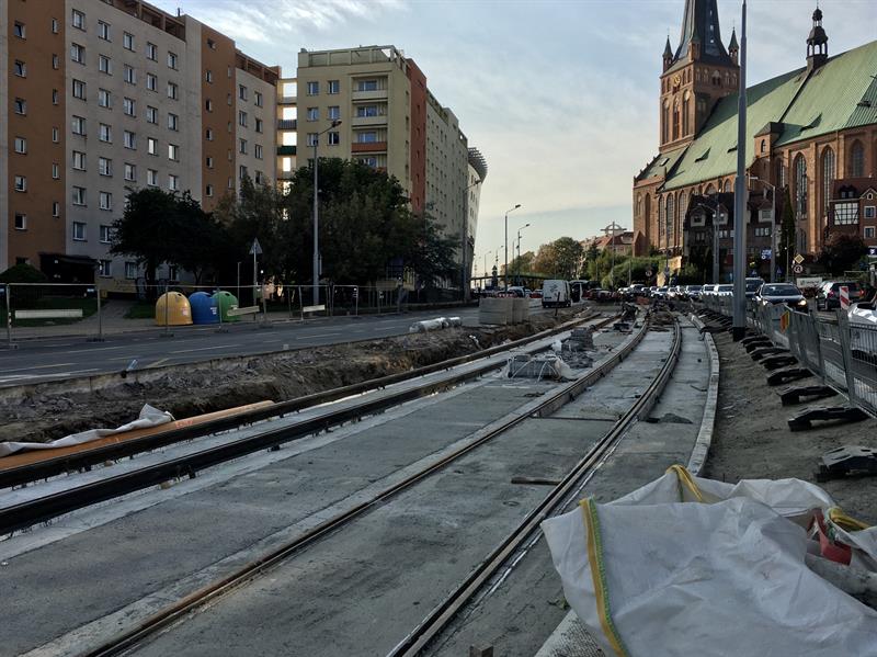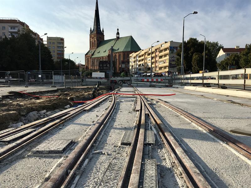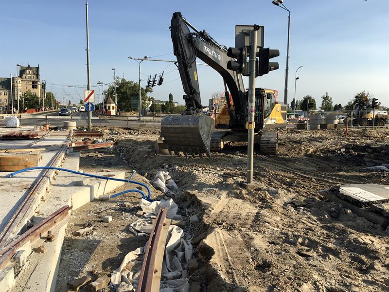 Wraz zamknięciem jezdni w kierunku prawobrzeża w rejonie przebudowywanego tam układu torowiska jeszcze tego samego dnia, tj. w sobotę, ruszyły prace rozbiórkowe starej nawierzchni. Równocześnie na wysokości przejść dla pieszych prowadzone są na wygrodzonym terenie głębokie wykopy pod montaż ostatnich odcinków nowych instalacji w pobliżu dojścia do nowego torowiska i przystanku z relacją skrętną do dworca PKP Szczecin Główny od strony ul. Nabrzeże Wieleckie. Trwają też prace przy układaniu i spawaniu szyn na gotowych fragmentach betonowej podbudowy na ostatnich kilkudziesięciu metrach przebudowywanego pasa torowiska do wysokości skrzyżowania z ul. Sołtysią.