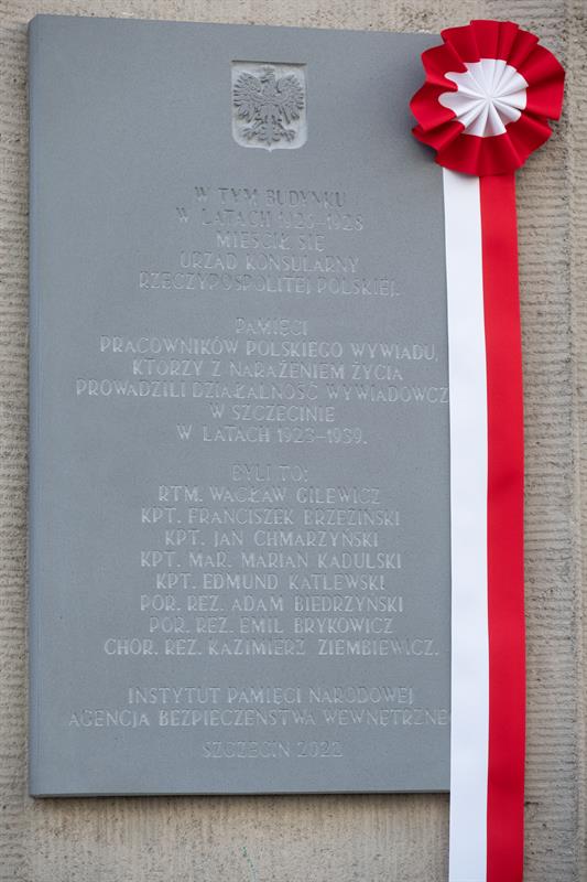 Na siedzibie delegatury Agencji Bezpieczeństwa Wewnętrznego przy ul. Małopolskiej w Szczecinie odsłonięto tablicę upamiętniająca pracowników polskiego wywiadu, którzy z narażeniem życia prowadzili działalność w naszym mieście w latach 1923 – 1939, gdy było ono ośrodkiem niemieckim. W uroczystości wzięli udział prezes Instytutu Pamięci Narodowej dr Karol Nawrocki oraz szef ABW płk. Krzysztof Wacławek. Stettin stanowił istotny cel dla polskich szpiegów – nie tylko z powodu swojego położenia geograficznego. Uhonorowani pracownicy wywiadu, którzy pracowali na odcinku szczecińskim, to: rtm. Wacław Gilewicz, kpt. Franciszek Brzeziński, kpt. Jan Chmarzyński, kpt. mar. Marian Kadulski, kpt. Edmund Katlewski, por. rez. Adam Biedrzyński, por. rez. Emil Brykowicz oraz chor. rez. Kazimierz Ziembiewicz.