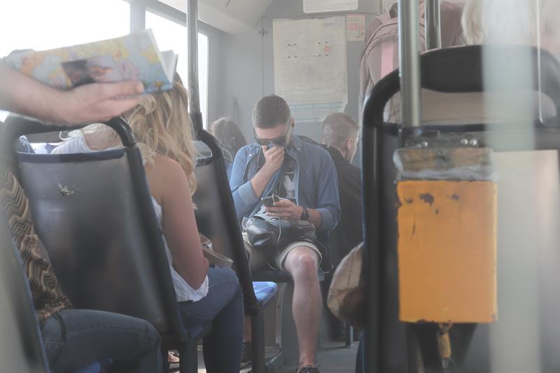Tak wygląda wnętrze jednego z autobusów linii nr 80, który pokonuje przebudowywaną ulicę Arkońską i plac budowy ronda u zbiegu al. Wojska Polskiego z ul. Szafera w Szczecinie. Pył z zewnątrz daje się pasażerom we znaki.