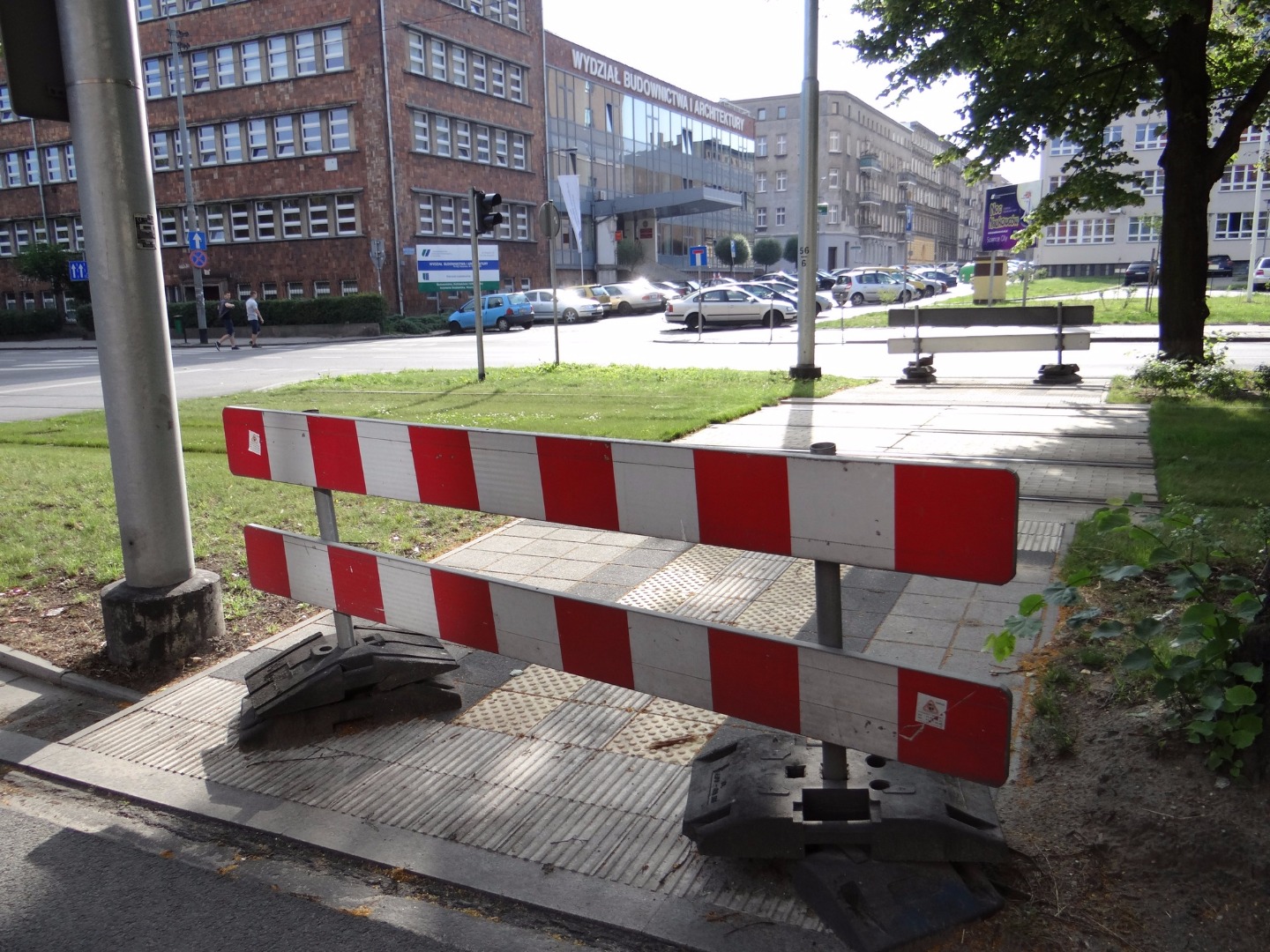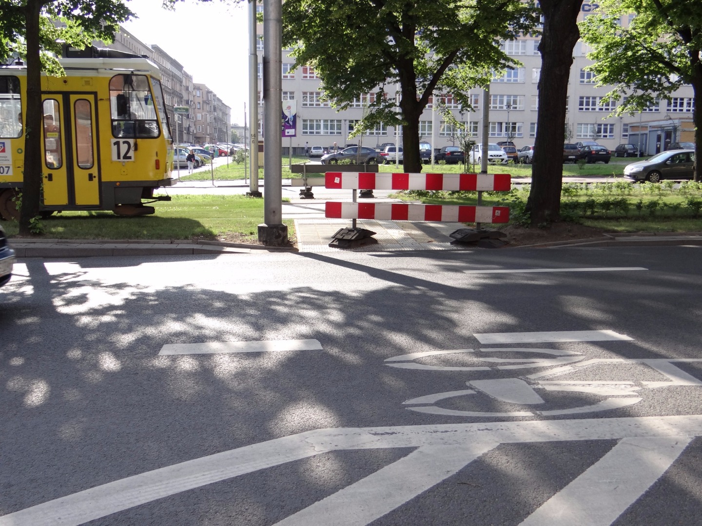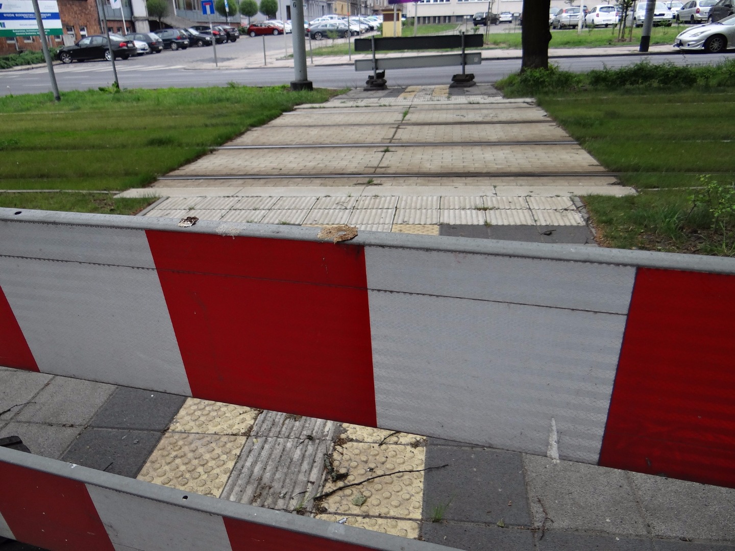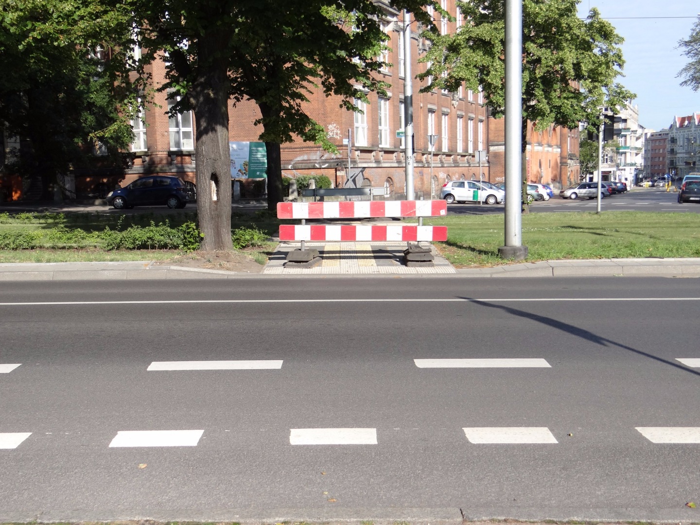 Nowe przejście dla pieszych przez nowe torowisko dla tramwajów w al. Piastów w Szczecinie, na wysokości skrzyżowania z ulicami Władysława Jagiełły i Kazimierza Pułaskiego, jest, ale go nie ma. Od wielu miesięcy jest zastawione z obu stron takimi oto barierami. Co autor tej instalacji miał na myśli, decydując w tym miejscu o jego blokadzie i likwidacji przejścia przez obie jezdnie al. Piastów?