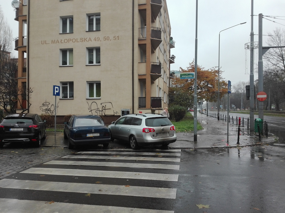 Piękne zdjęcie. Widać na nim puste chodniki i brak miejsca do parkowania. Tak, ostatnio modne są "siwe słupki" zamiast miejsc parkingowych. Czy to jest słuszne? - śmiem twierdzić, że nie. Ludzie muszą gdzieś parkować swoje samochody, muszą dojechać by załatwić sprawę czy zrobić zakupy. Uszczęśliwianie mieszkańców siwymi słupkami świadczy o zdziczeniu przeciwników samochodów. Niech szeroki chodnik pozostanie pusty i niech nikomu nie służy byleby nie stanął na nim samochód. Te auta na przejściu to ewidentne wykroczenie ale świadczy też o desperacji kierowców, kiedy trzeba stanąć choć na pół godziny a tu nie ma gdzie.