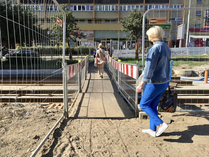 - Wożę go na zajęcia rehabilitacyjne, jakie się odbywają na basenie Raddisona. Jest bardzo, bardzo ciężko - przyznaje nasza Czytelniczka. - Szczególnie odcinek przez piach i wąską kładkę. Dlaczego nad budowanym torowiskiem przerzucono ją tak wąską? Przejście powinno mieć co najmniej 1,5 metra szerokości. Gdy faktycznie ma niespełna metr. Dla wózków inwalidzkich to szerokość na styk. Nie powinno być aż za wąsko! Bo to niebezpieczne zarówno dla osoby niepełnosprawnej, jak i jego opiekuna. Tym bardziej, że barierki na kładce są ustawione tylko symbolicznie. Nie utrzymają osoby, która straciłaby równowagę. A już na pewno nie powstrzymałaby przed upadkiem bezwładnego inwalidy na wózku. Uważam, że to skandaliczne zaniedbanie odpowiedzialnych za bezpieczeństwo pieszych na tymczasowych przejściach, urządzonych nad przebudowywanymi torowiskami. Najwyższy czas to zmienić!