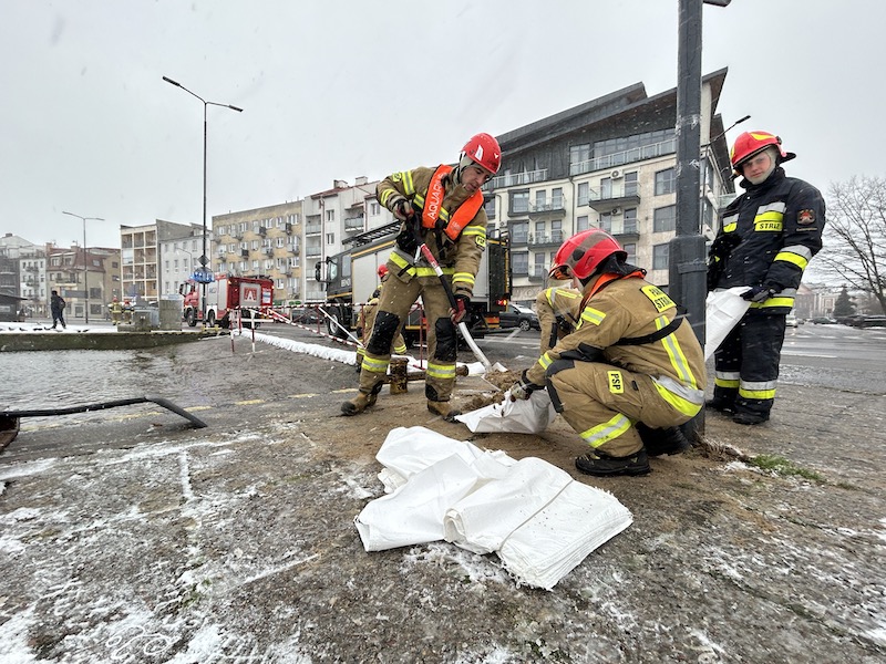 Państwowa Straż Pożarna zadecydowała o zabezpieczeniu slipów workami z piaskiem. Przed południem strażacy zabezpieczyli je wzdłuż ulicy Wybrzeże Władysława IV. Pomogła także Wojskowa Straż Pożarna. Worki układane są prewencyjnie i mają ochronić przed wylaniem wody z kanału portowego wprost na ulicę.