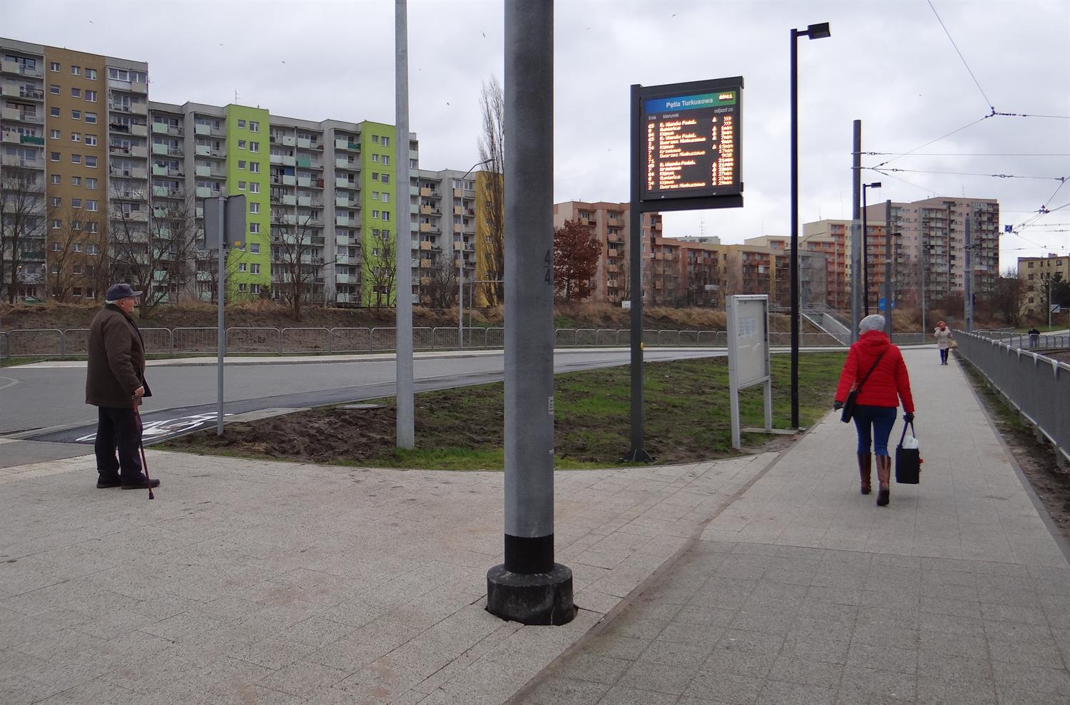 Pierwszego dnia po wprowadzeniu zmian - na co zwracali uwagę podróżni - były też kłopoty z synchronizowaniem komunikatów na tablicach LED, będących częścią centralnego systemu zarządzania komunikacją, których zadaniem jest wyświetlanie i uaktualnianie godzin odjazdu tramwajów i autobusów poszczególnych linii. Zastrzeżenia części z nich dotyczą także samej lokalizacji wyświetlaczy. Tylko jeden z nich, ten ustawiony przy chodniku przy dojściu do peronów tramwajów od strony nasypu z bocznicą kolejową, wskazuje na godziny odjazdów zarówno tramwajów, jak i autobusów. Co sprawia, że tylko przy przesiadce z autobusu, zatrzymującego się na jednym z dwóch peronów dla wysiadających, tym bliżej toalety i przejścia na jej wysokości, pasażer ma możliwość sprawdzenia, o której godzinie ma najbliższy kurs tramwaju bądź autobusu danej linii. Kiedy autobus podjeżdża na stanowisko bliżej placu manewrowego, skąd np. do tramwajów droga dojścia jest krótsza, na taką informację o najbliższych odjazdach pasażer już liczyć nie może.