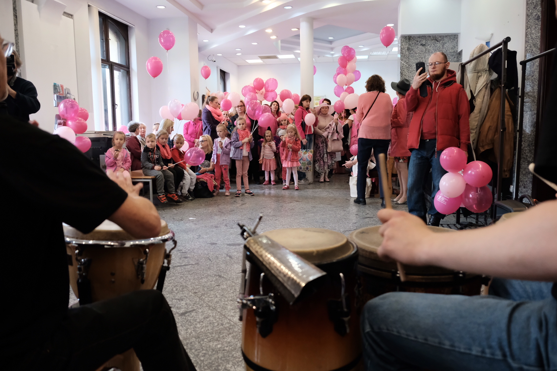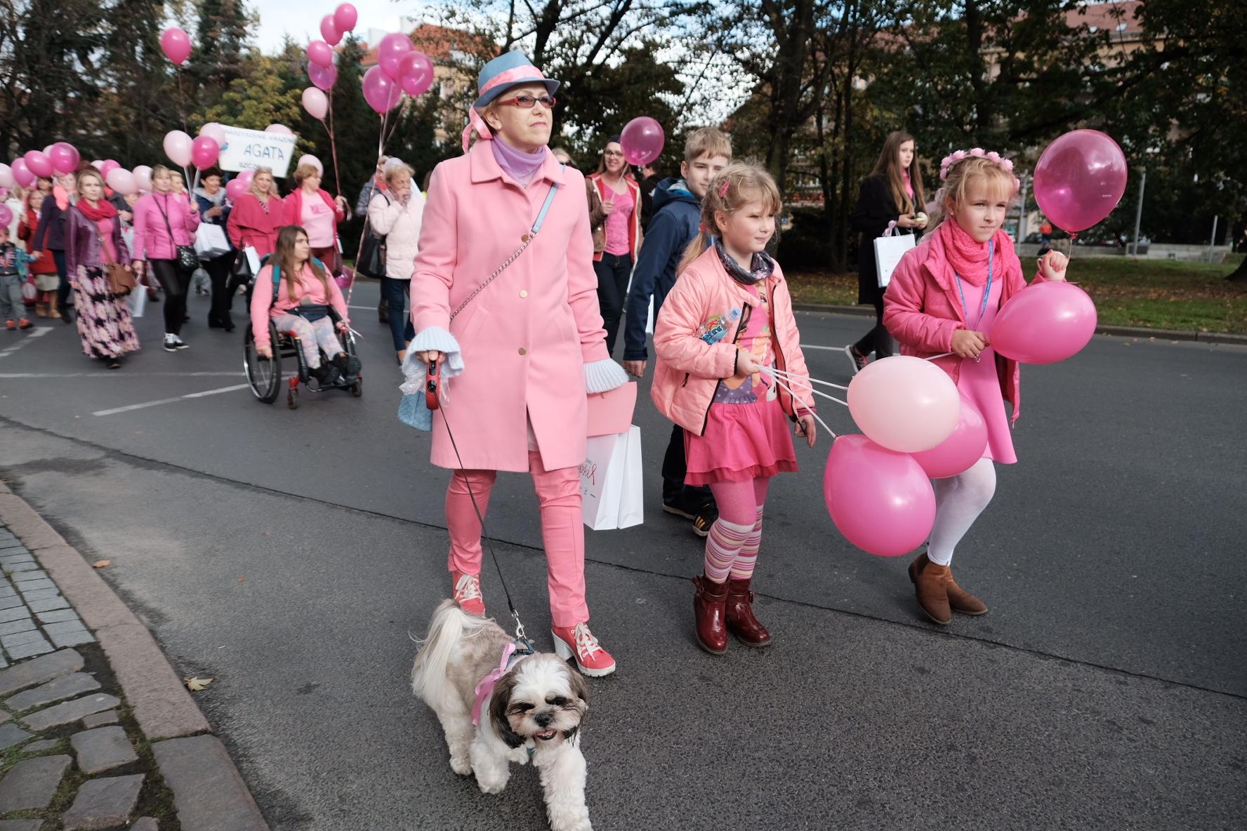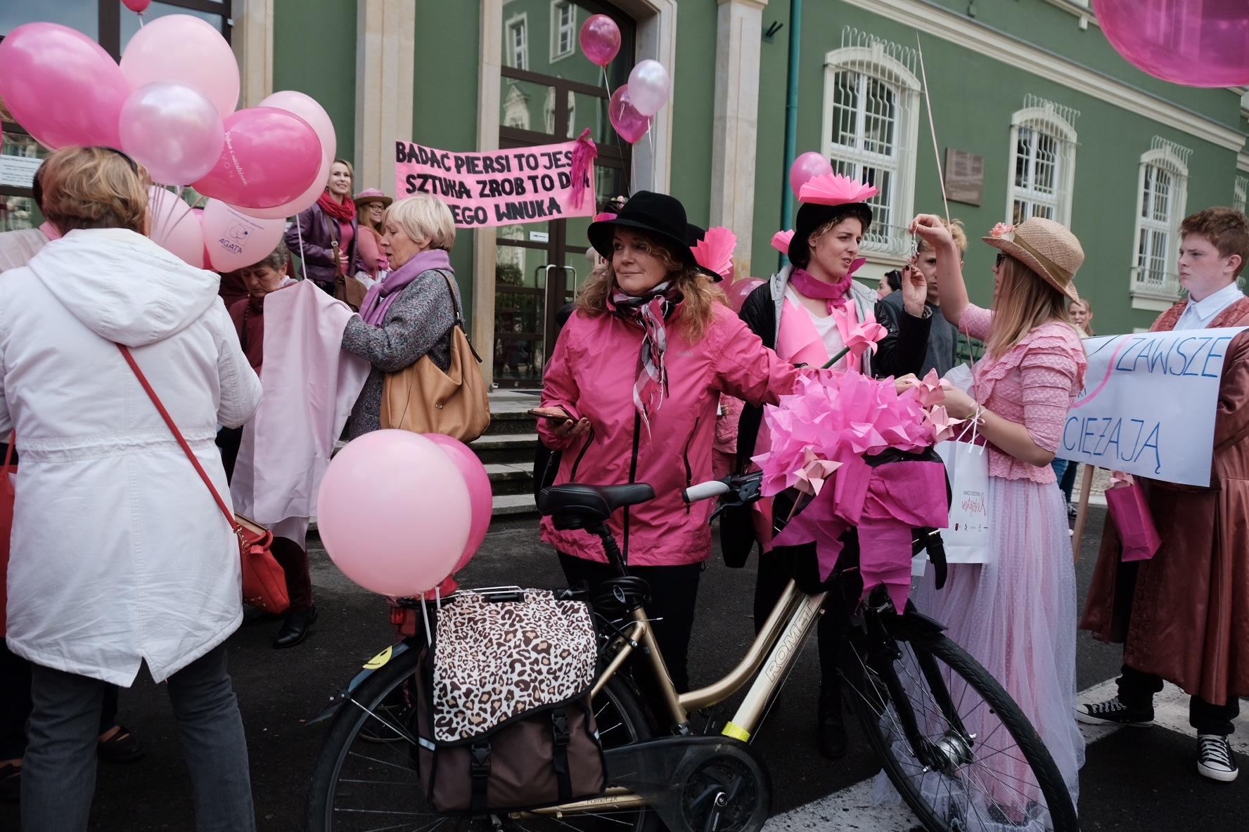 We wspaniałych różowych strojach, zaprezentowali się przedstawiciele Młodzieżowego Ośrodka Socjoterapii przy ul. Jagiellońskiej. Dziewczęta niosły transparent "Badać piersi to jest sztuka, zrób to dla swojego wnuka".