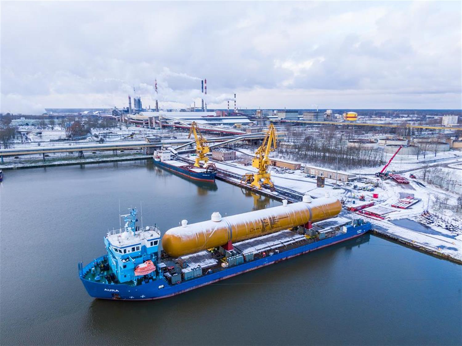Zbiornik na propylen dotarł z Gdyni do polickiego portu barkowego 15 bm. na pokładzie statku „Aura”, który w niedzielę odpłynął. Ponadgabarytowy ładunek ma ponad 70 m długości, a waży ok. 600 ton.