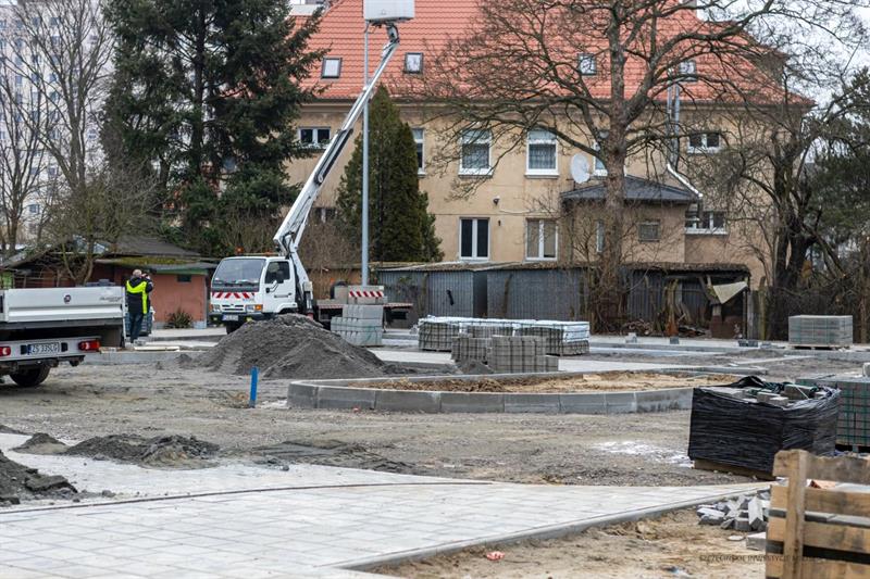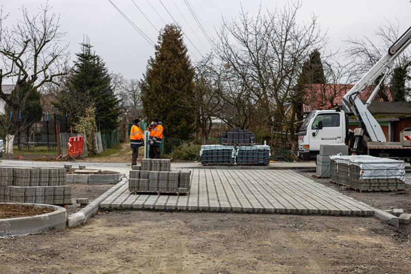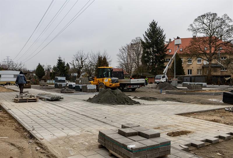 Przez ostatnie dni trwały prace związane z wykonywaniem nawierzchni chodników i parkingów, jak również prace związane z zasilaniem i montażem słupów oświetlenia.