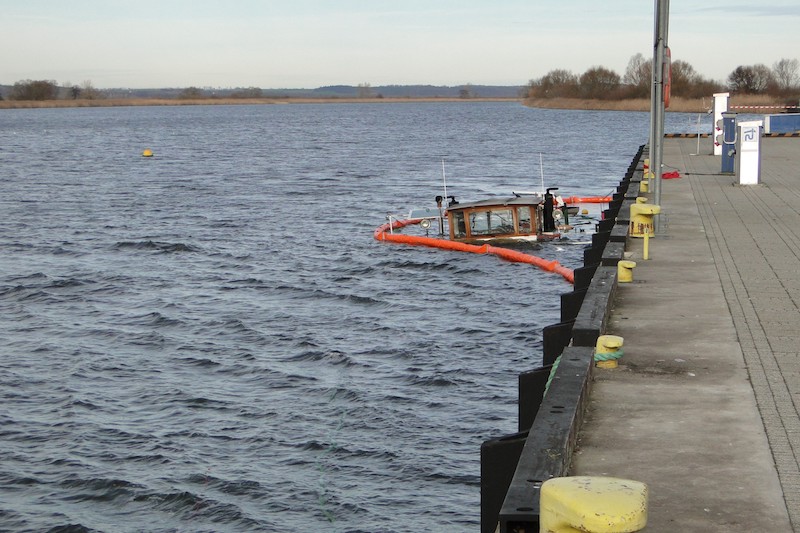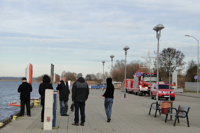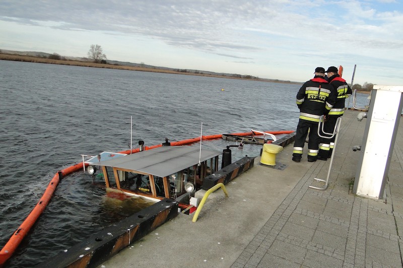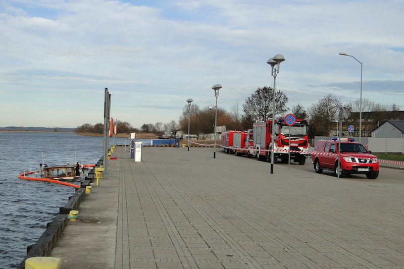 Trwa akcja ratownicza. Strażacy usuwają niewielką plamę, powstałą z zaolejonej wody zęzowej, którą wiatr spycha w kierunku przystani wędkarskiej. Z uzyskanej na miejscu zdarzenia informacji wynika, że zbiorniki z paliwem są szczelne.