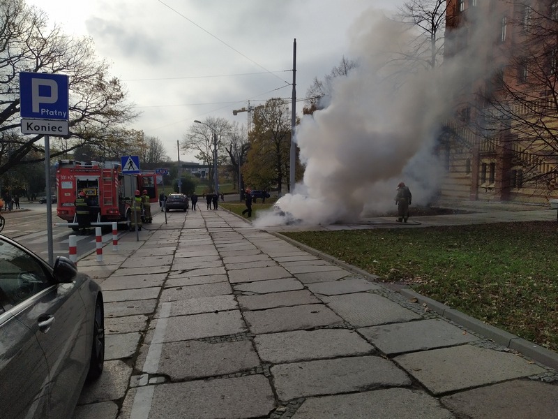 Z auta wydobywały się duże ilości dymu. Na razie nie wiadomo, co było przyczyną pożaru. Strażacy szybko ugasili ogień. Nikomu nic się nie stało.