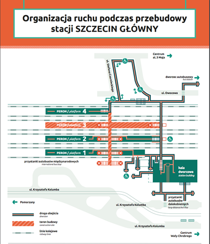 Zwężenie górnego odcinka ulicy obejmuje pas chodnika przy murze oporowym, biegnącym wzdłuż torów. Na części zablokowanego dla ruchu kołowego prawego pasa jezdni między barierkami wytyczone jest teraz przejście dla pieszych i podróżnych, dla których to teraz - po zamknięciu starej kładki - jedyna droga dotarcia do pociągów odjeżdżających z peronu 4 lub dojście do miasta z tego peronu dla przyjeżdżających. Powód tych zmian to roboty przy trwającej przebudowie stacji.
