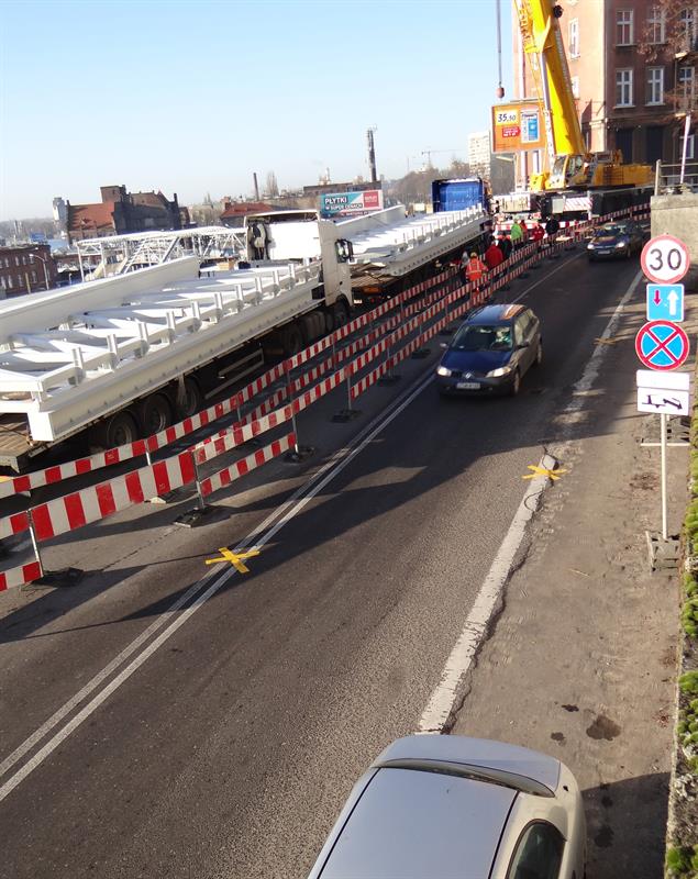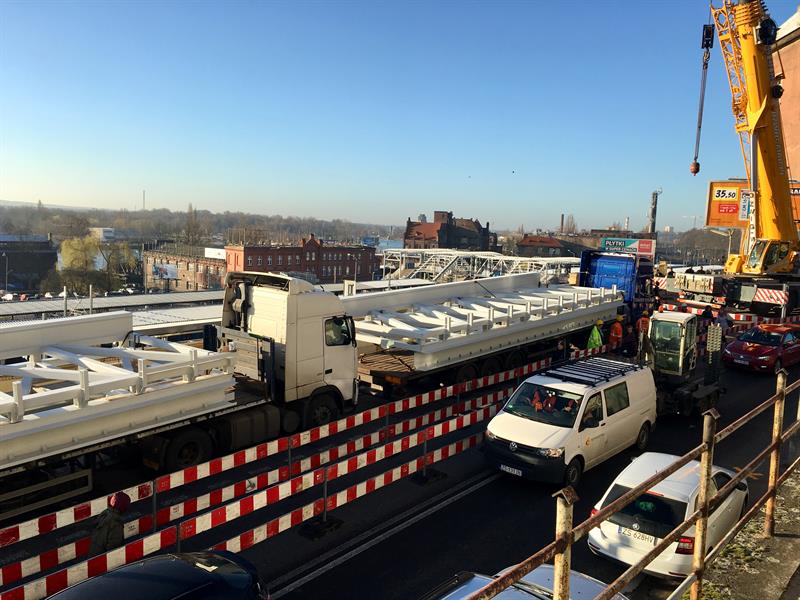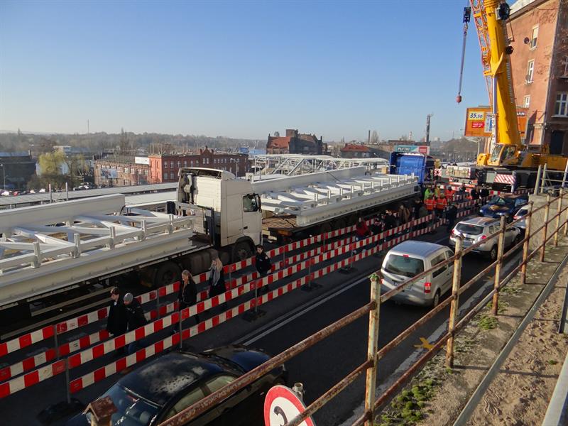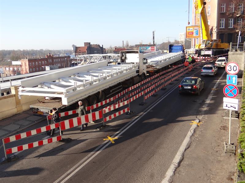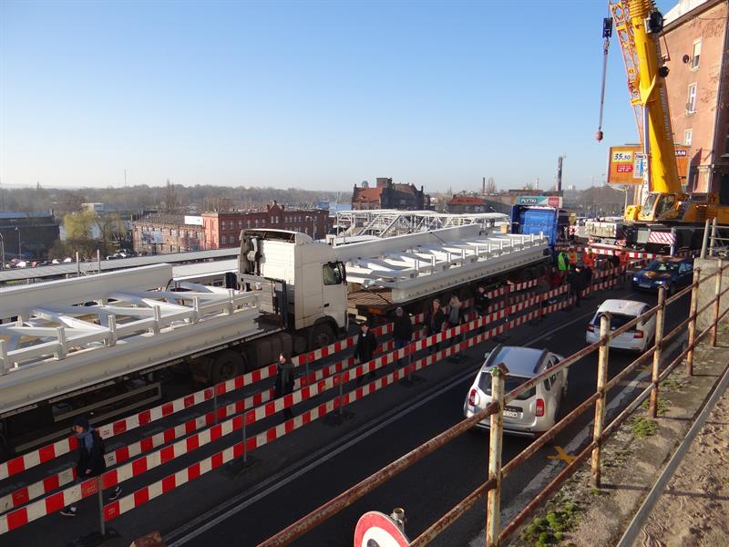 Z tego miejsca przy użyciu specjalistycznego żurawia montowane będą na stalowych podporach elementy konstrukcji kładki, która jednocześnie ma być dachem, nad modernizowanym obecnie peronem trzecim dworca. Dźwig już tam się pojawił, zwiezione też zostały pierwsze z modułów przyszłego łącznika-zadaszenia, jakie ma spiąć przebudowywaną starą kładkę z tą w nowej części dworca (obecnie czynną) nad torami, wzniesioną kilka lat temu.