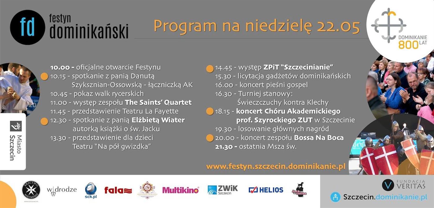 - W tym roku zapraszamy do wysłuchania koncertu szczecińskich muzyków "Bossa Na Boca" oraz występu Chóru Akademickiego im. prof. Jana Szyrockiego ZUT w Szczecinie - zapowiadają organizatorzy. - Zatańczy dla nas Zespół Pieśni i Tańca "Szczecinianie". W programie także pokazy walk rycerskich Bractwa Maltańskiego, spotkanie z Elą Wiater - autorką książki o św. Jacku, pierwszym polskim dominikaninie, i Danutą Szyksznian - "żołnierką wyklętą", mieszkającą na terenie parafii św. Dominika. Dzieci zapraszamy na warsztaty lalkarskie i garncarskie oraz przedstawienia teatralne grup "La Fayette" i "Na pół gwizdka". Liczymy na przybycie wielu gości na nasze wspólne świętowanie.