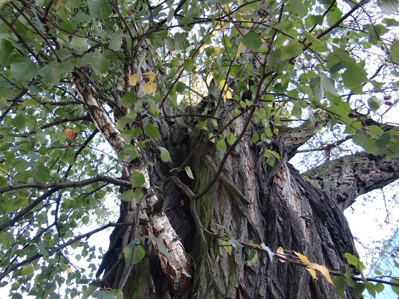Sprawdziliśmy. Faktycznie - jak widać na zdjęciu - samosiejka brzozy pasożytuje na macierzystym drzewie: wrasta w jego kieszeniową dziuplę, rozsadzając ją i dodatkowo osłabiając główny pień robinii. Tak od lat. O czym świadczy zarówno wielkość korony, jak i obwód pnia brzozy. Chociaż służby odpowiedzialne za stan miejskiej zieleni do tego nie powinny dopuścić.