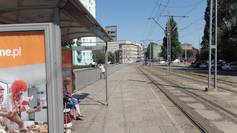 Faktycznie, gdyby istniał ranking brzydkich i fatalnych przystanków komunikacji miejskiej, ten przy ul. Dubois - tramwajowy, kierunek pl. Rodła - miałby spore szanse na wygraną. Zajmuje więcej niż cały pas ruchu od przejścia dla pieszych przy ul Łady, aż po kolejne - na wysokości ul. Sławomira. Całość jest wyłożona betonowymi płytami, choć aż się prosi, aby w tę martwą przestrzeń - w upały rozgrzaną niczym patelnia - wprowadzić choć odrobinę zieleni.