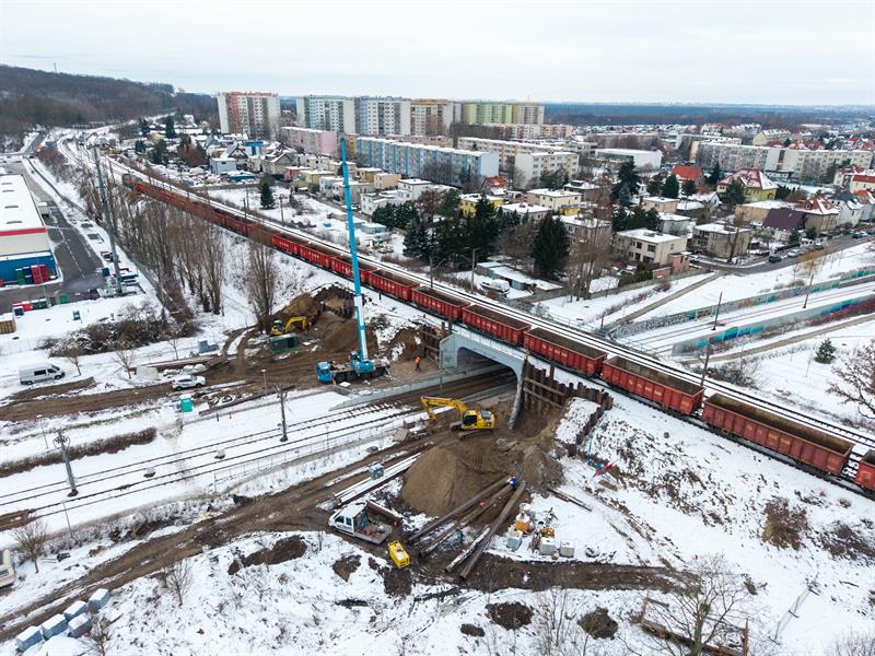 Foto przedstawia wiadukt kolejowy, pod którym mamy tory tramwajowe biegnące wzdłuż ul. Jaśminowej, do pętli na zapleczu sklepu selgros.