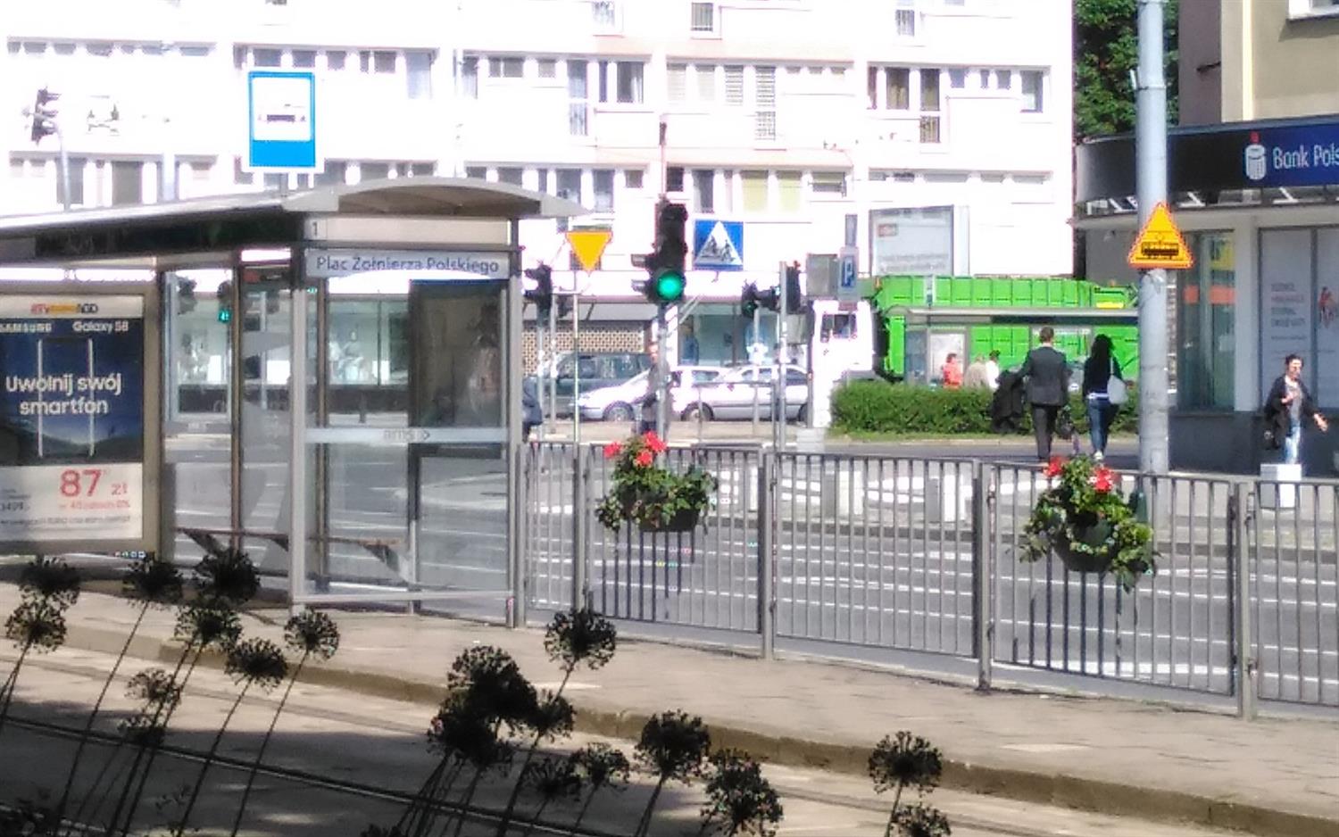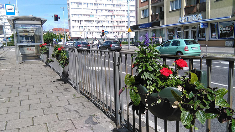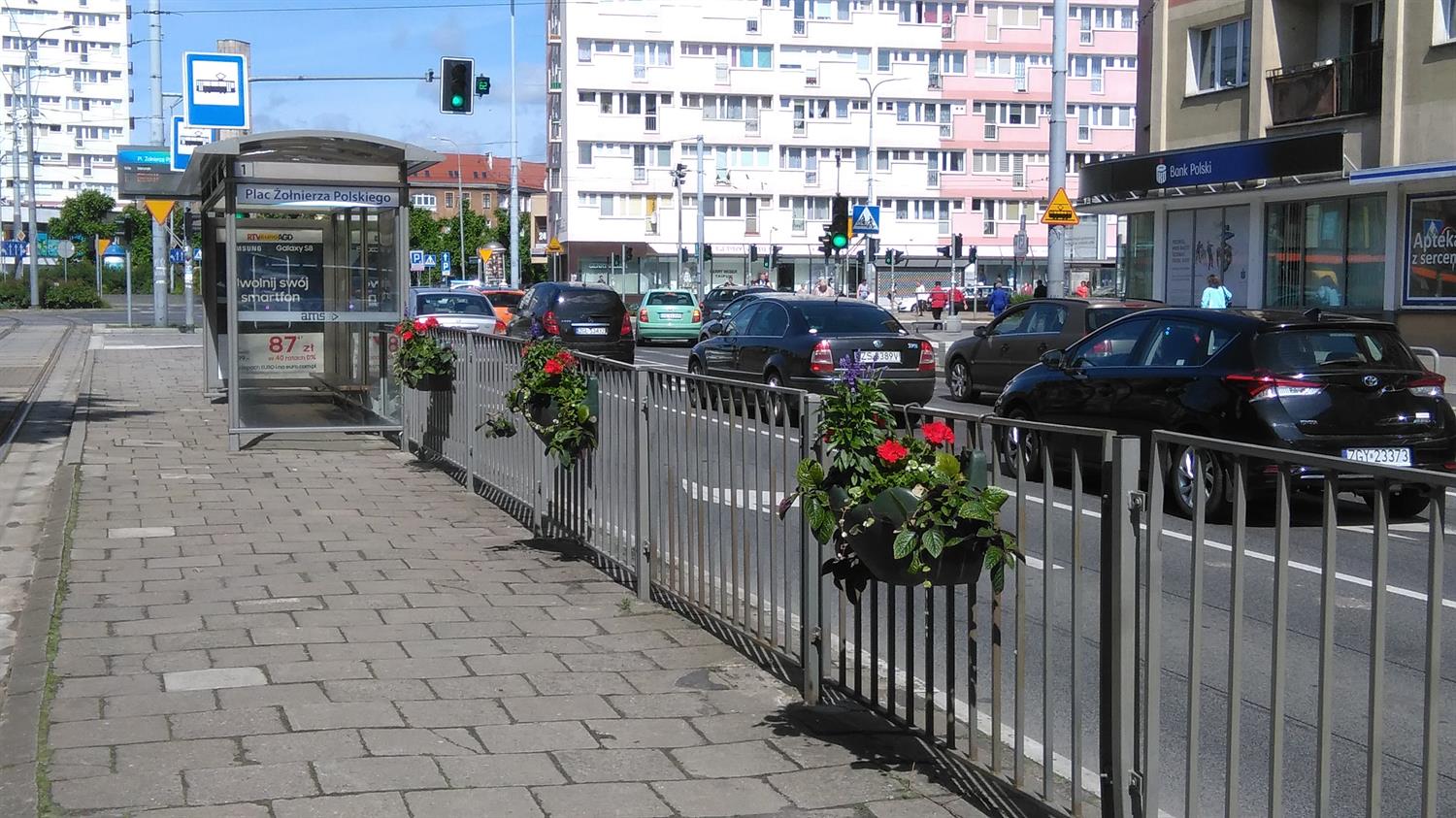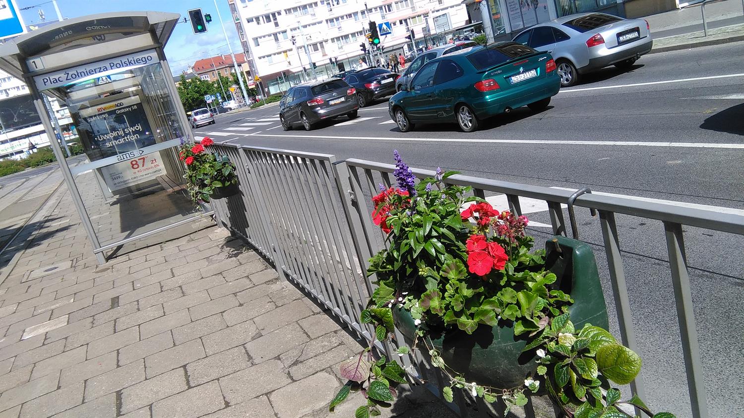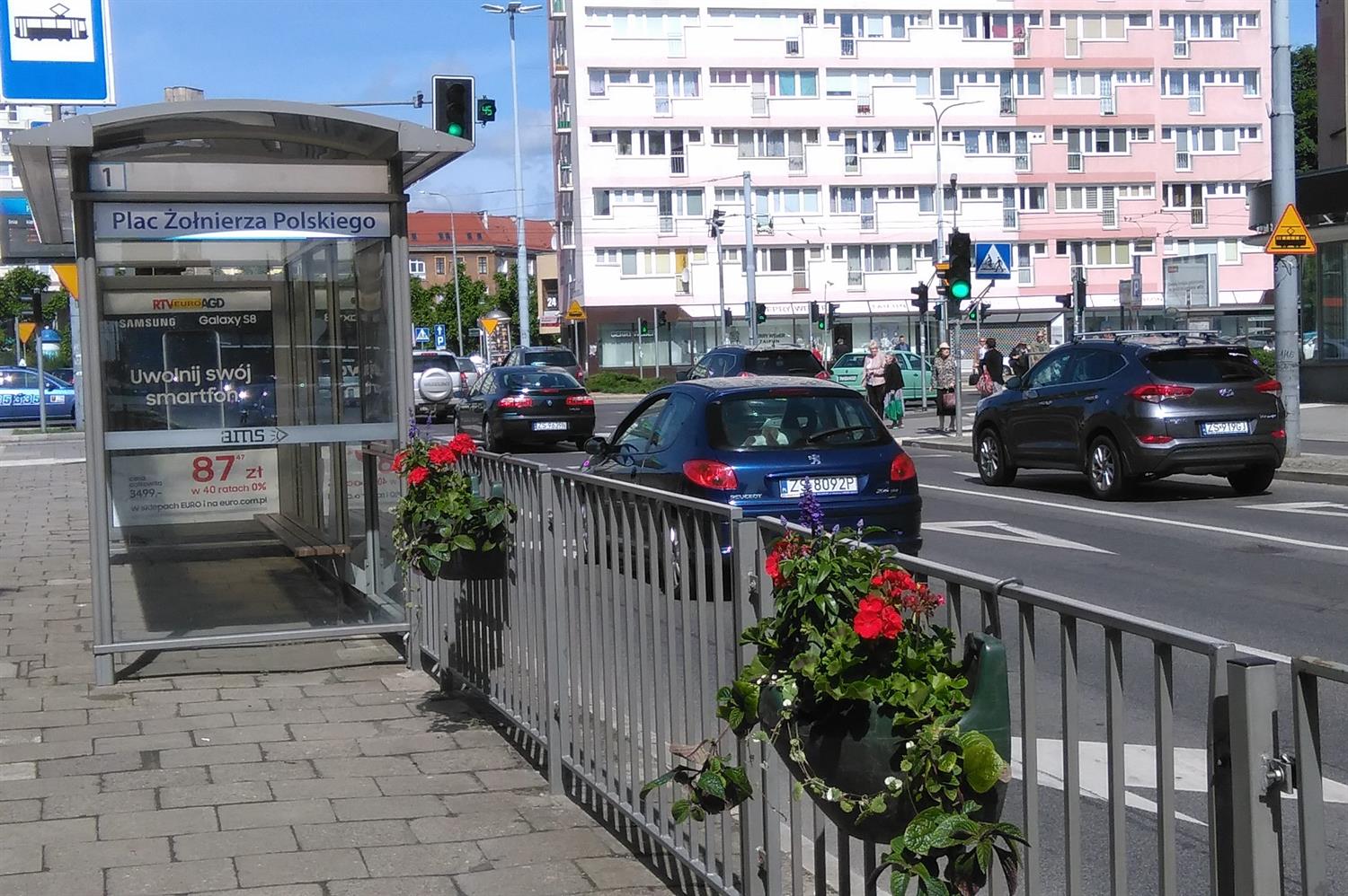 Gdzie? W Szczecinie! Pierwszy przystanek, na którego barierkach pojawiły się ample z kwiatami, jest na pl. Żołnierza Polskiego - tuż przy dawnej alei kwiatowej. W tak wyjątkowych „okolicznościach przyrody" - jak widać na zdjęciu - na pewno przyjemniej oczekiwać na przyjazd „jedynki".