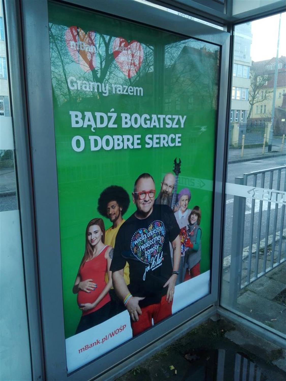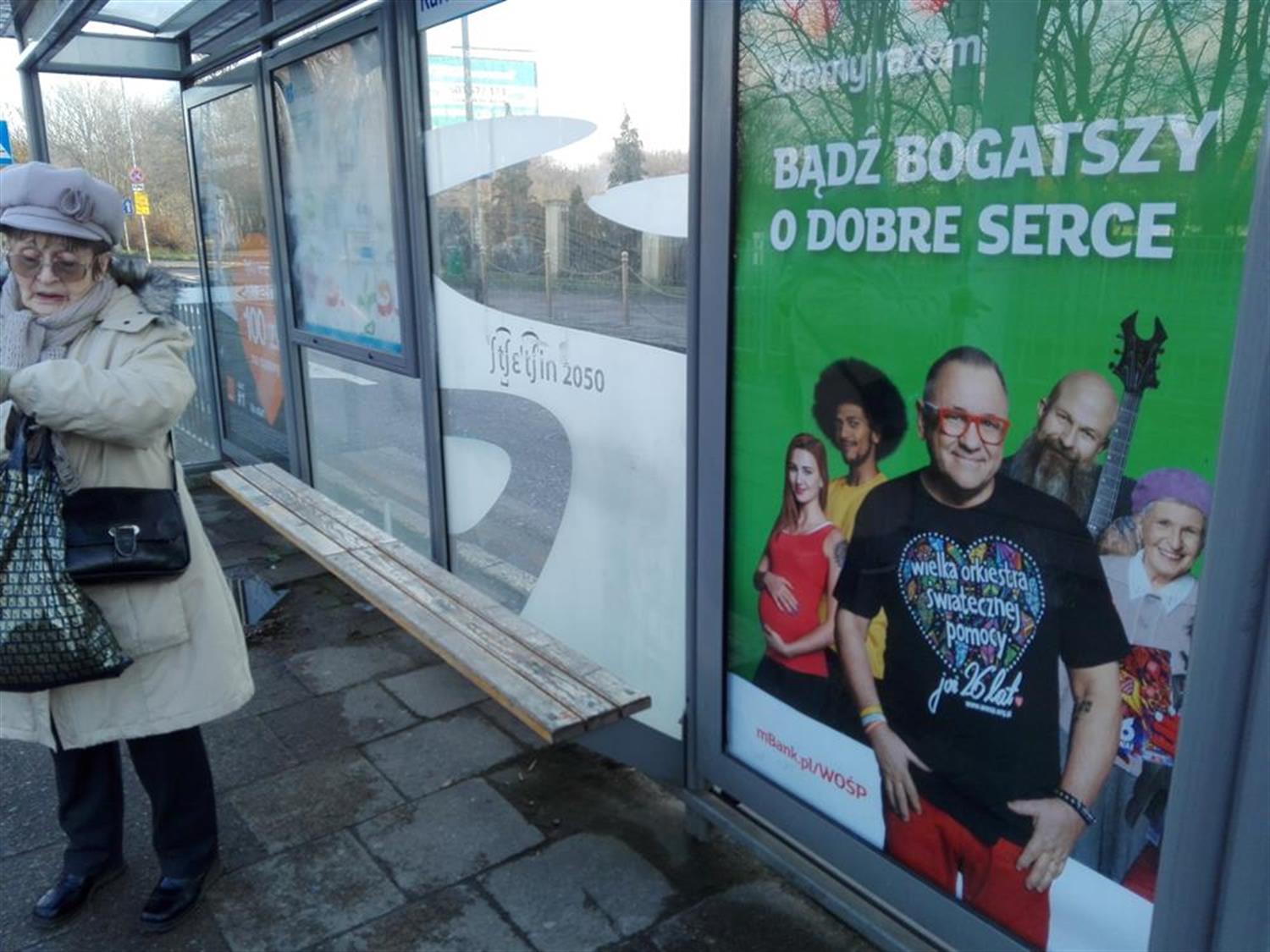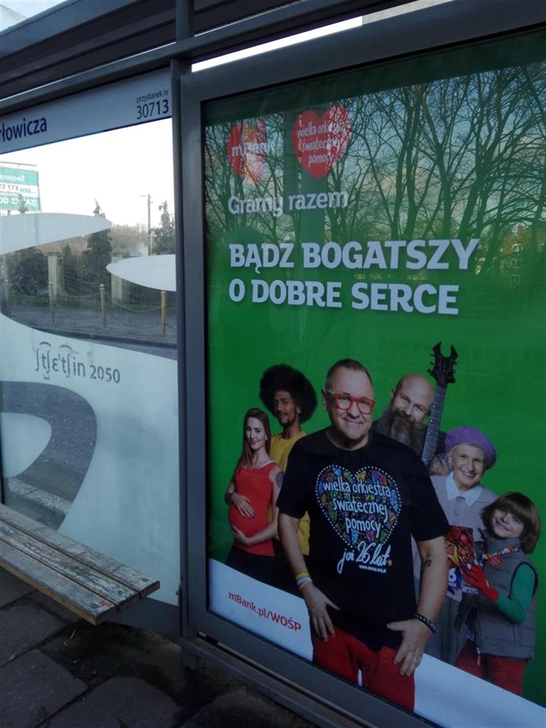 "Bądź bogatszy o dobre serce" - przy plakacie z takim hasłem Wielkiej Orkiestry Świątecznej Pomocy, zdobiącym przystanek przy ul. Mickiewicza w Szczecinie, naprawdę przyjemniej się czeka na tramwaj.