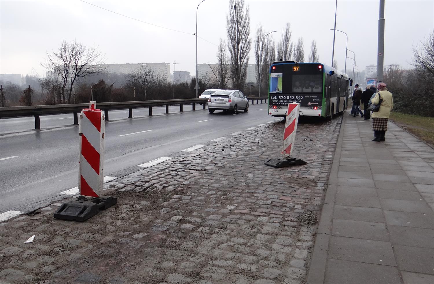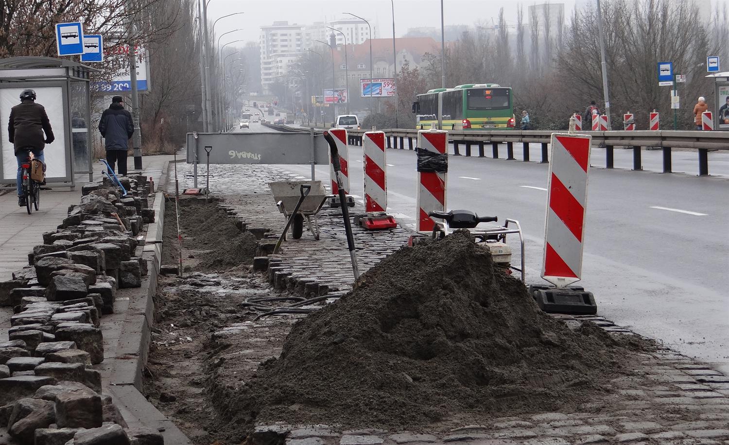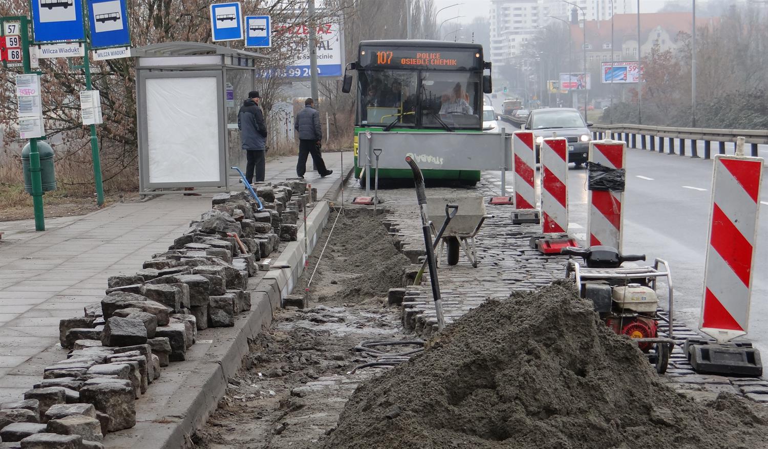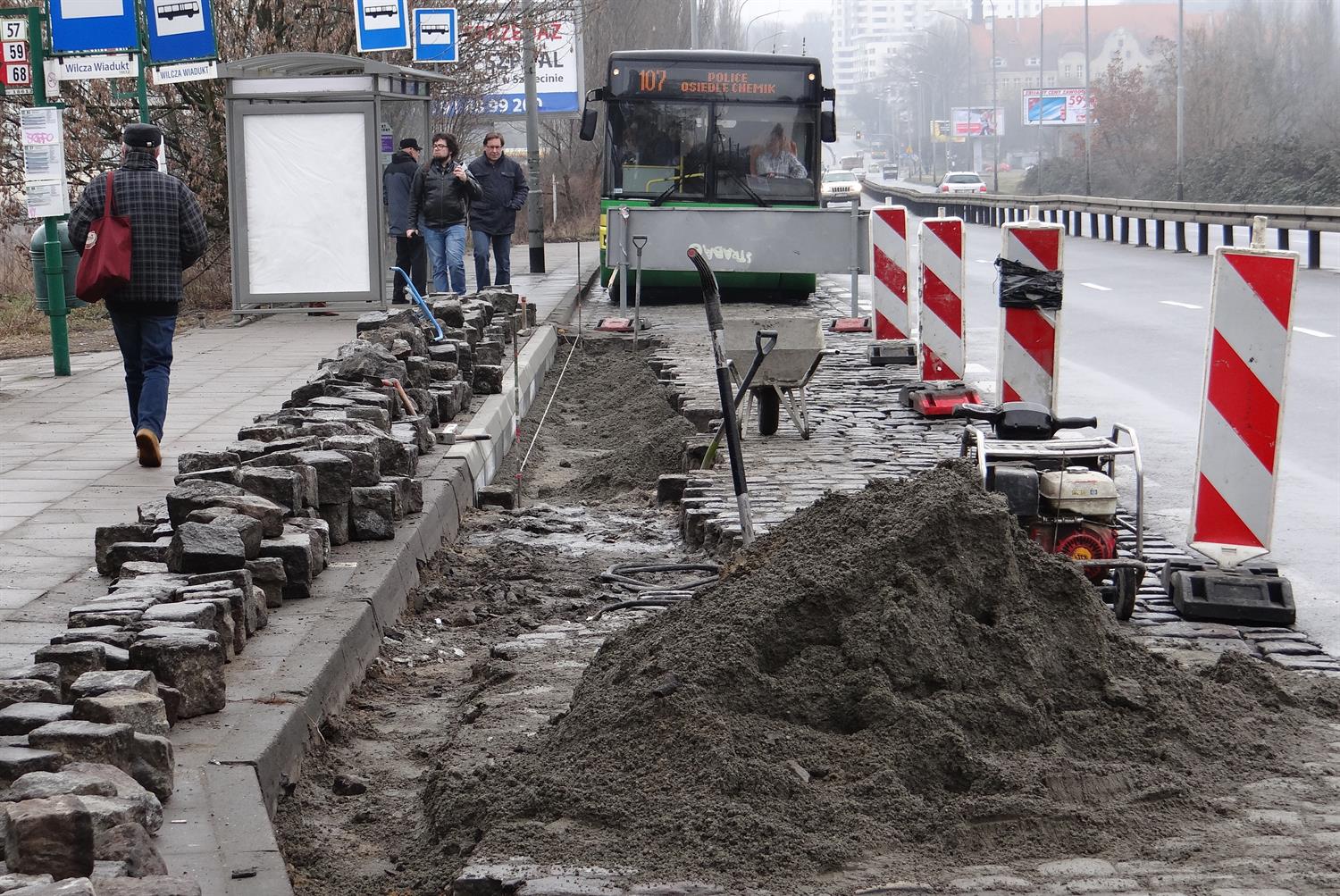 Roboty brukarskie przy przekładaniu nawierzchni zatok autobusowych na przystankach przed wiaduktem u zbiegu ulic Rynkowej i Sczanieckiej w Szczecinie. Likwidacja kolein na przystanku Wilcza Wiadukt w kierunku centrum rozpoczęła się jeszcze w lutym. Jak tłumaczy Marta Kwiecień-Zwierzyńska z ZDiTM, ze względów technologicznych prace zostały przerwane, gdyż zaprawa cementowa musi związać, by kostka brukowa nie wypadała. W tym czasie prace były i są nadal prowadzone jednocześnie na przystanku w kierunku Polic. Finał napraw ma nastąpić z końcem marca. Na zlecenie dla Strabagu w ramach umowy z ZDiTM na bieżące utrzymanie dróg jako podwykonawca wykonuje je spółka LJ Drogan. Wcześniej w ramach tej samej umowy na pętli autobusowej w szczecińskich Podjuchach zakończył się też pierwszy z przewidzianych w tym roku doraźnych remontów. Wymienione zostały tam płytki chodnikowe trzech peronów autobusów i krawężniki. Planowany jest jeszcze remont samej nawierzchni jezdni na pętli. ©℗