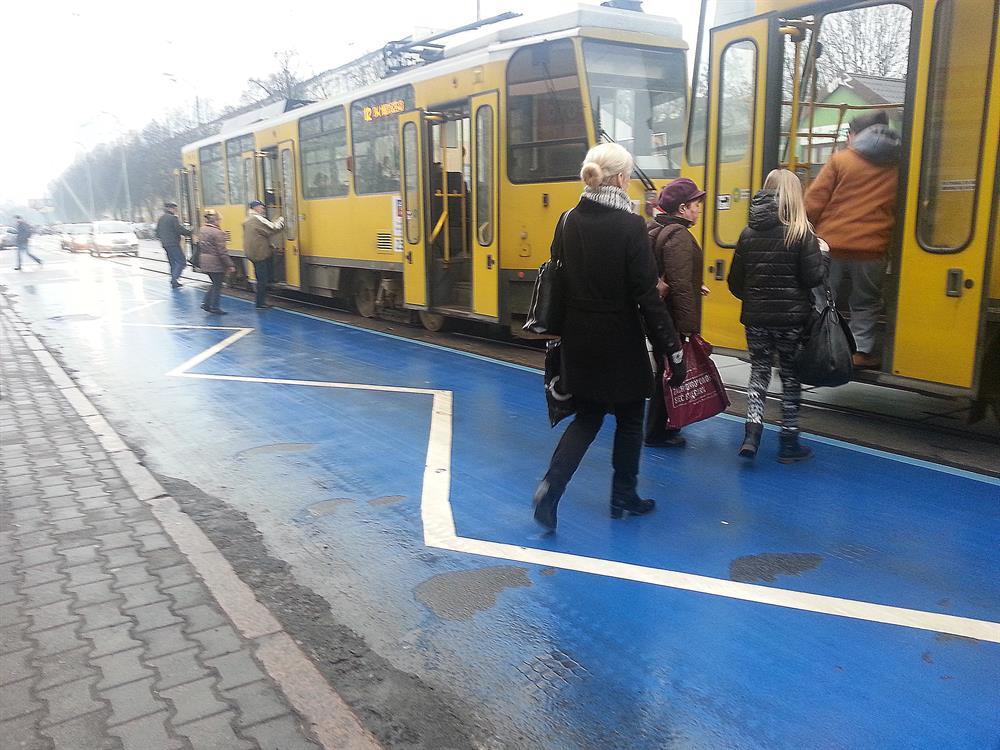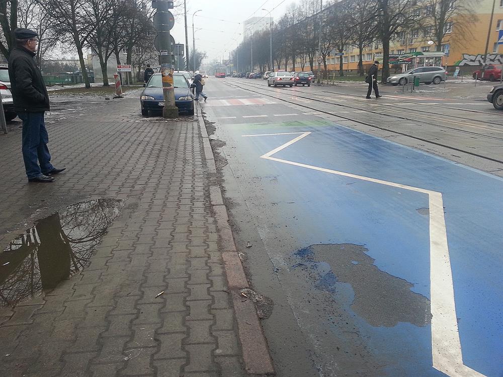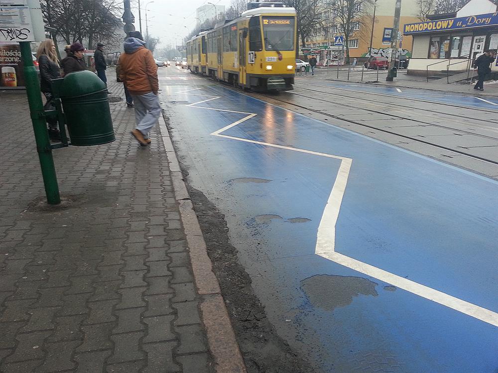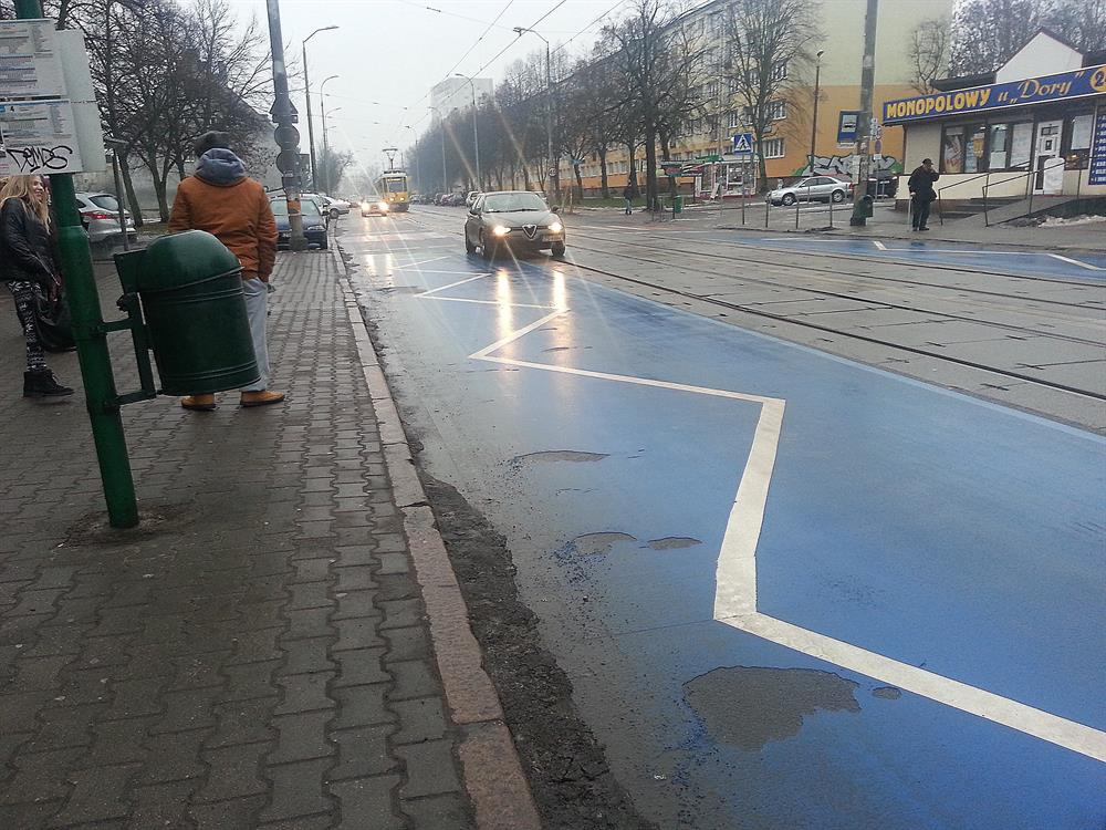 Przecież gdy tramwaj się zatrzymuje na przystanku to żaden pojazd i tak nie ma prawa wjechać poza jego tylną krawędź, więc sam biały zygzak wystarczy by ostrzegać że w tym miejscu nie wolno parkować - gdyby jakiemuś nieuważnemu kierowcy zachciało się zatrzymać auto w obrębie przystanku podczas nieobecności tramwaju. Te niebieskie mazaje niby w czym mają poprawiać bezpieczeństwo? Czemu kierowca ma zwalniać przy przystanku gdy nie stoi tam tramwaj? Że niby pieszy może wyjść na jezdnię? Z jakiego powodu? Przecież gdy nie stoi tam pojazd szynowy to jest to taka sama część jezdni jak każda inna - ani nie jest to przejście dla pieszych ani obszar wyłaczony z ruchu, więc po co niby kierowca ma nagle hamować dojeżdzając do przystanku? Żadne przepisy RD nie nakazują takiego zachowania.