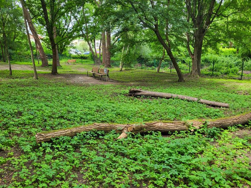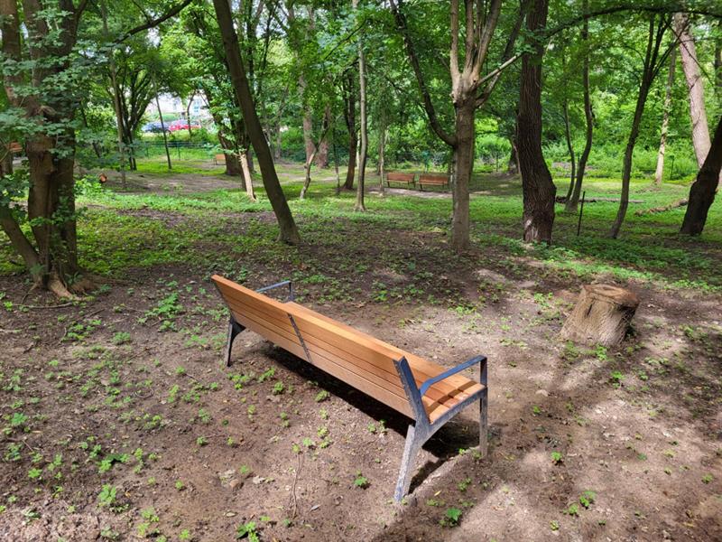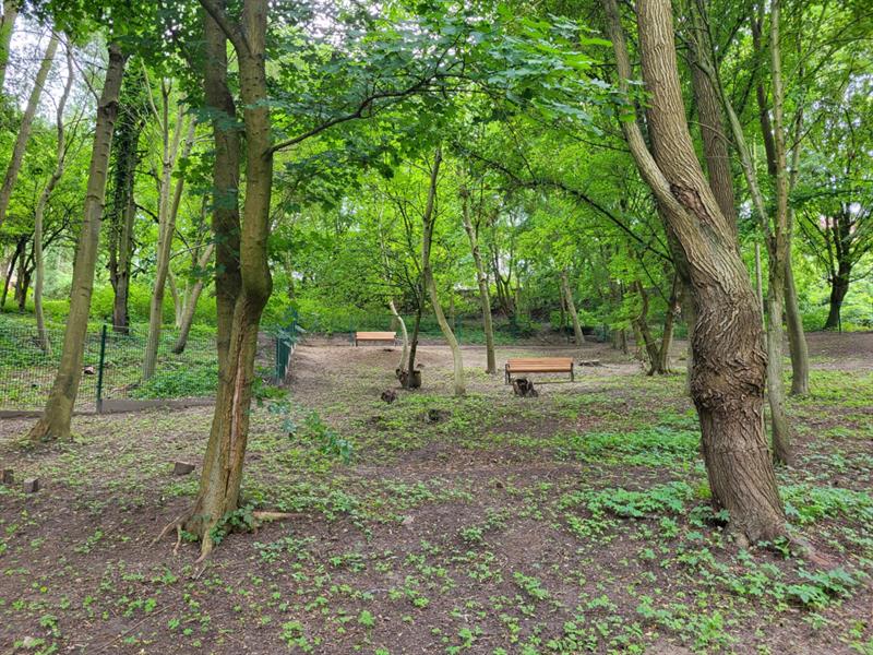 Na polanie stanęły ławki parkowe, tablice informacyjne, pojemniki na odpady i dystrybutory woreczków. Teren pokrywa naturalne runo leśne z przedeptami. Pozostawiono na nim również wywrócone pnie drzew, na których psiaki mogą trenować skoki i inne sztuczki.
