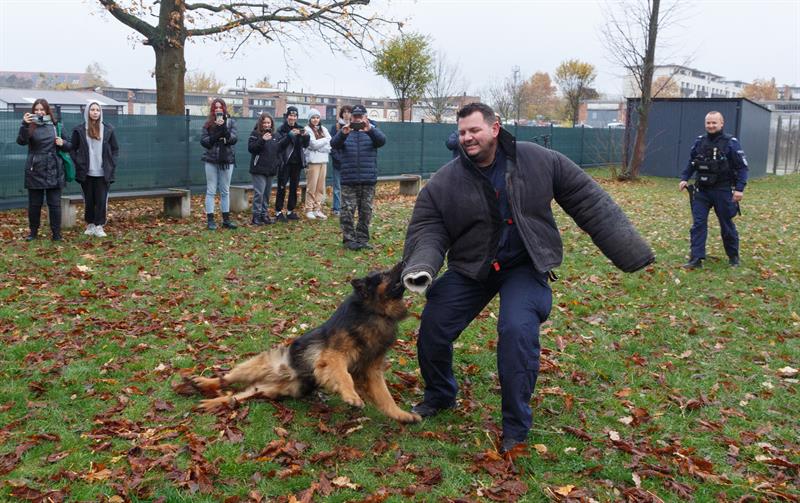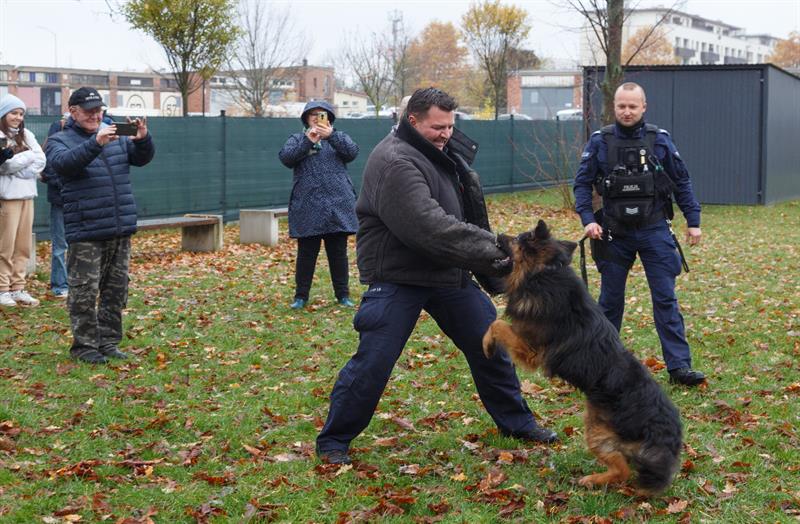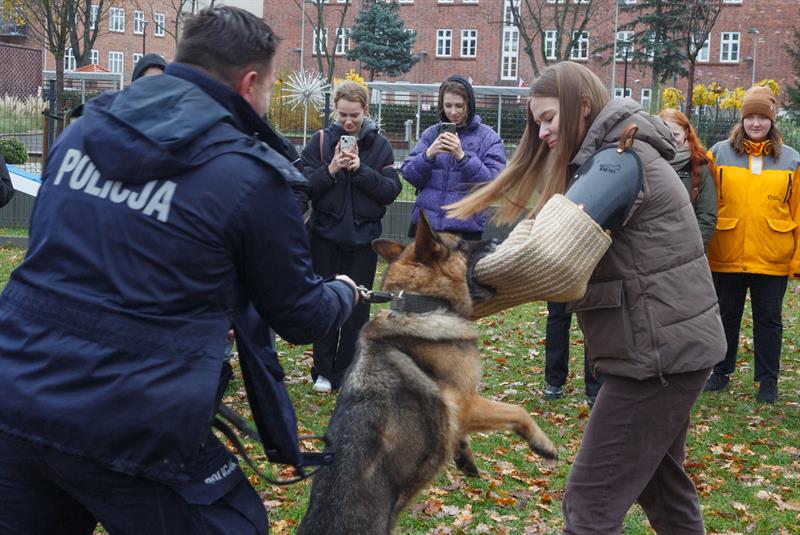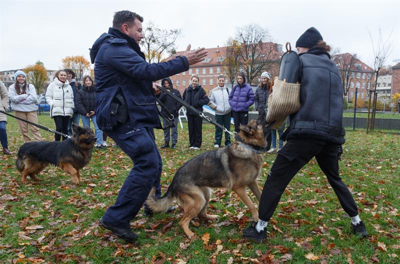 Marcin Jarosiński podczas zajęć założył strój pozoranta i pozwolił zaatakować się psu. Atak owczarka mogli też poczuć na sobie studenci, chronieni przez specjalne rękawy.©℗